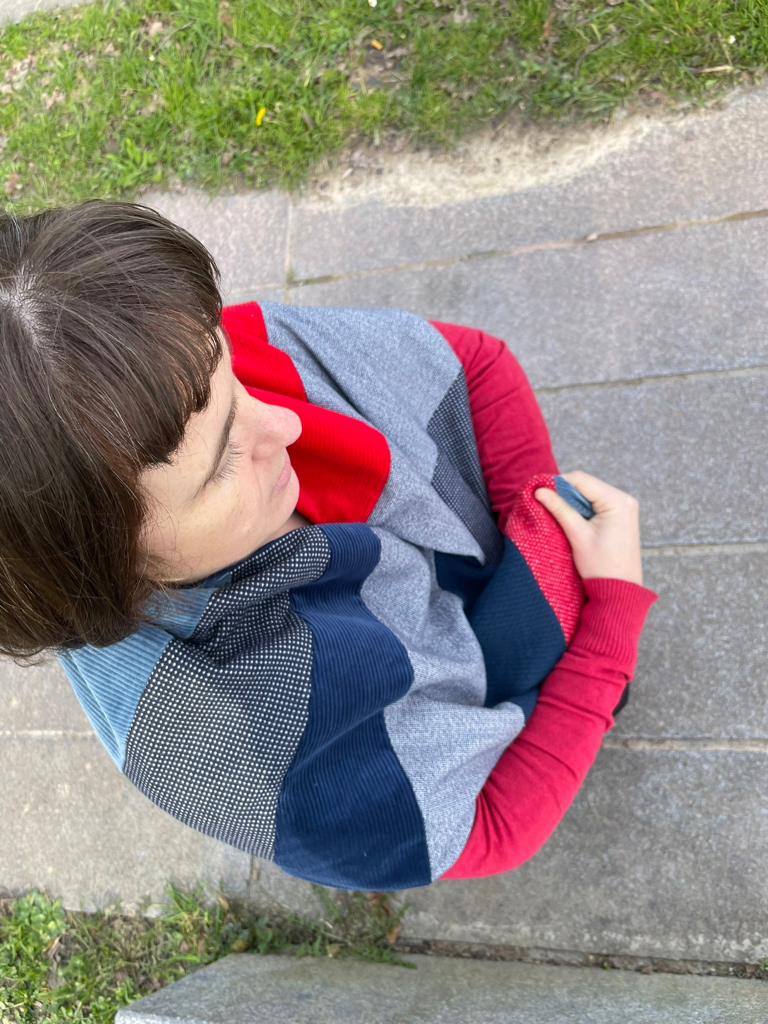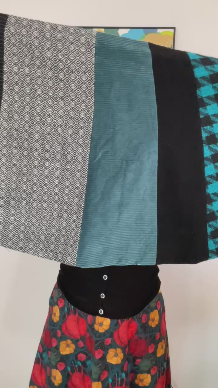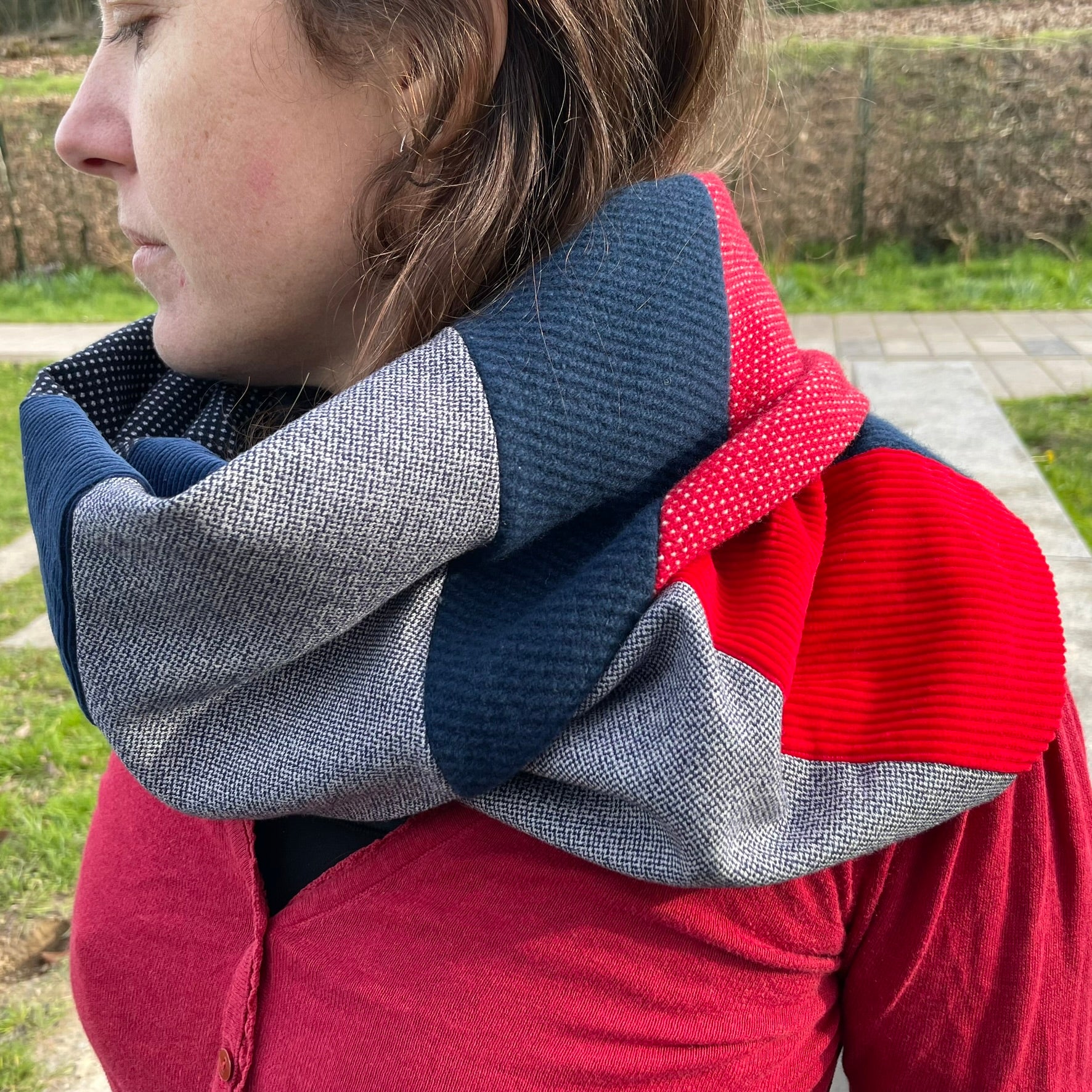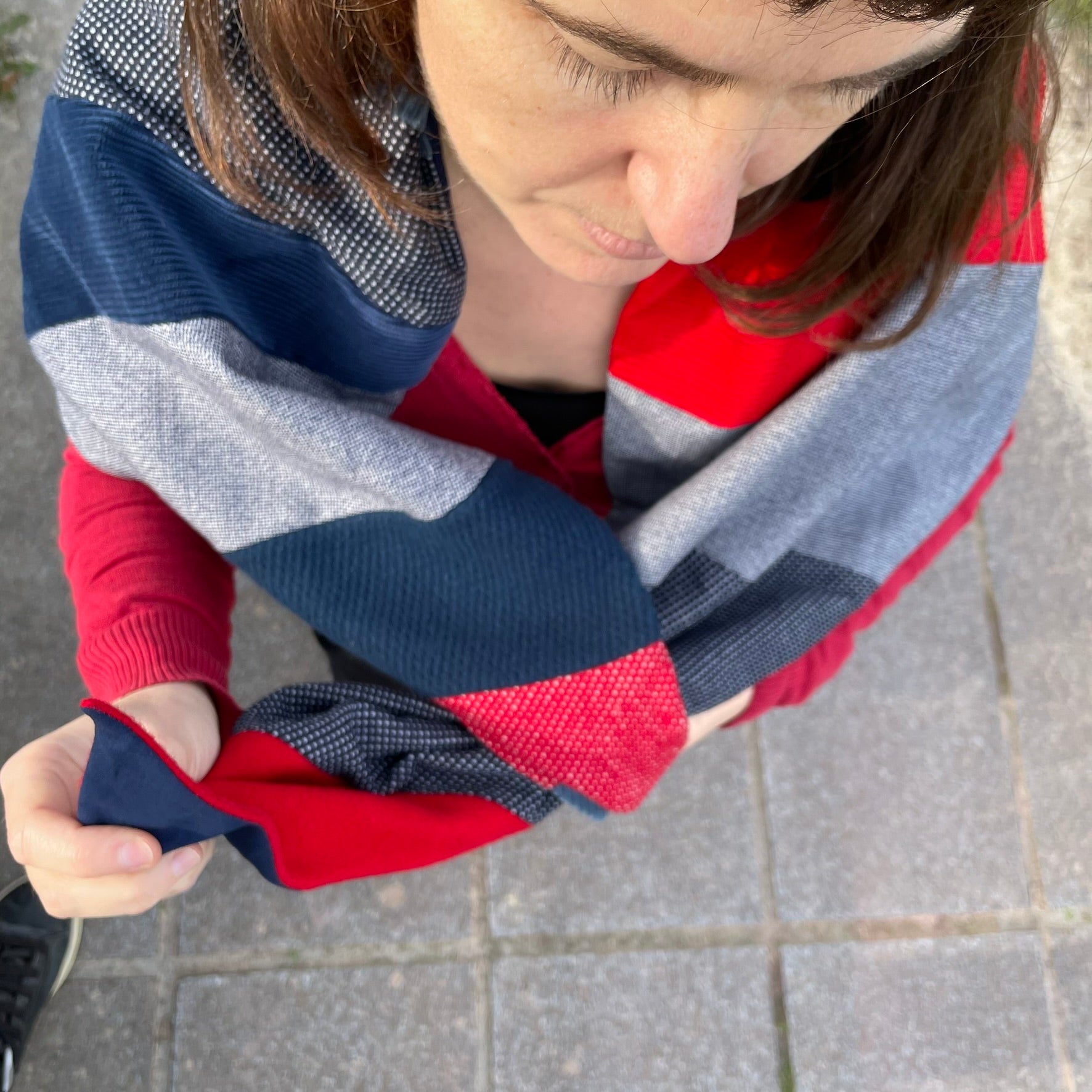 Modèle dans les tons bleus et rouge, il peut être porté de différentes manières : sur les épaules, autour du cou, en capuchon...