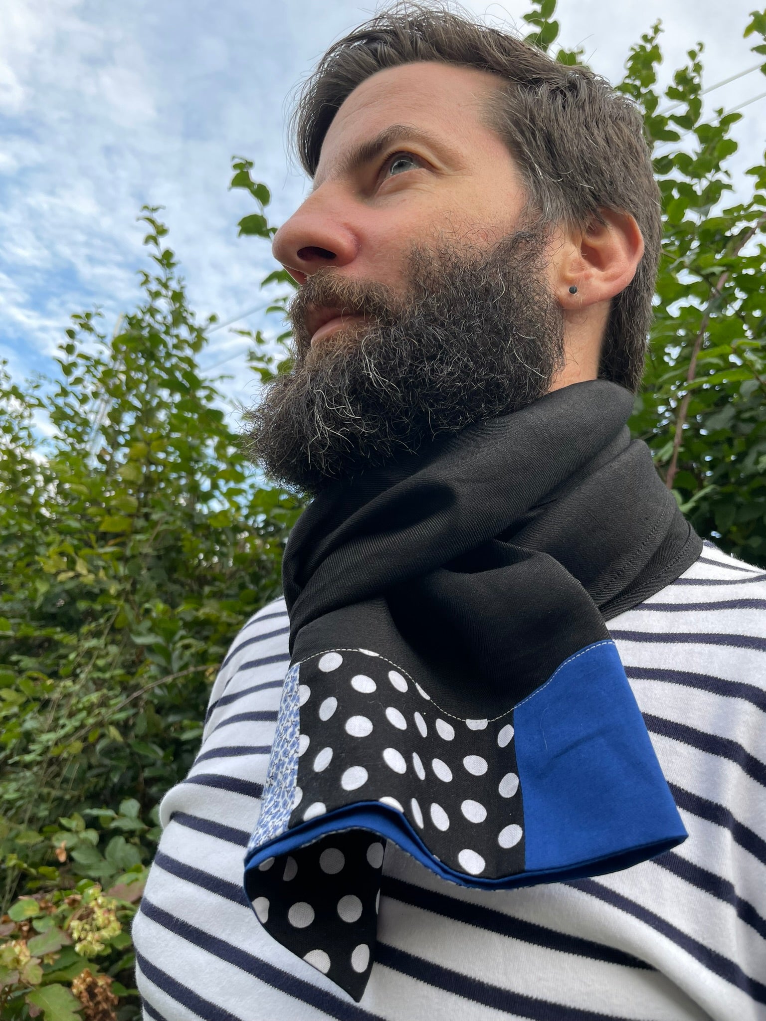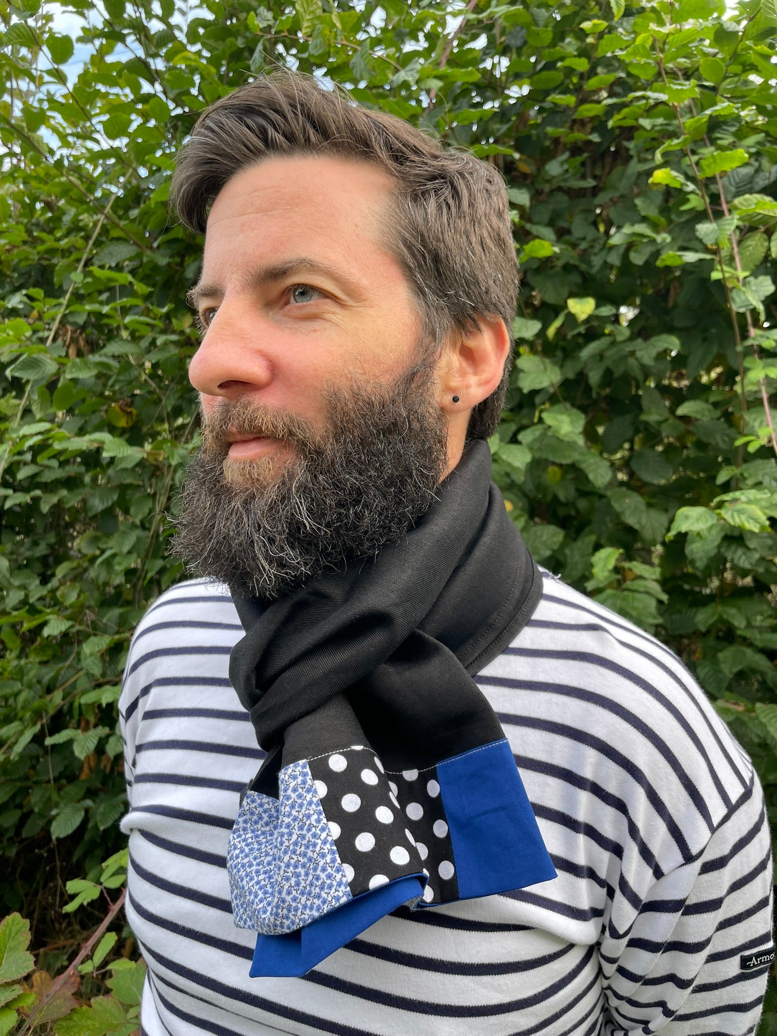 Chèche homme (ou mixte car un foulard est-ce vraiment genré ?) en lin et viscose noir, bande de tissus différents,esprit un peu patchwork, à une des extrémités, dans les tons bleu, noir et blanc.