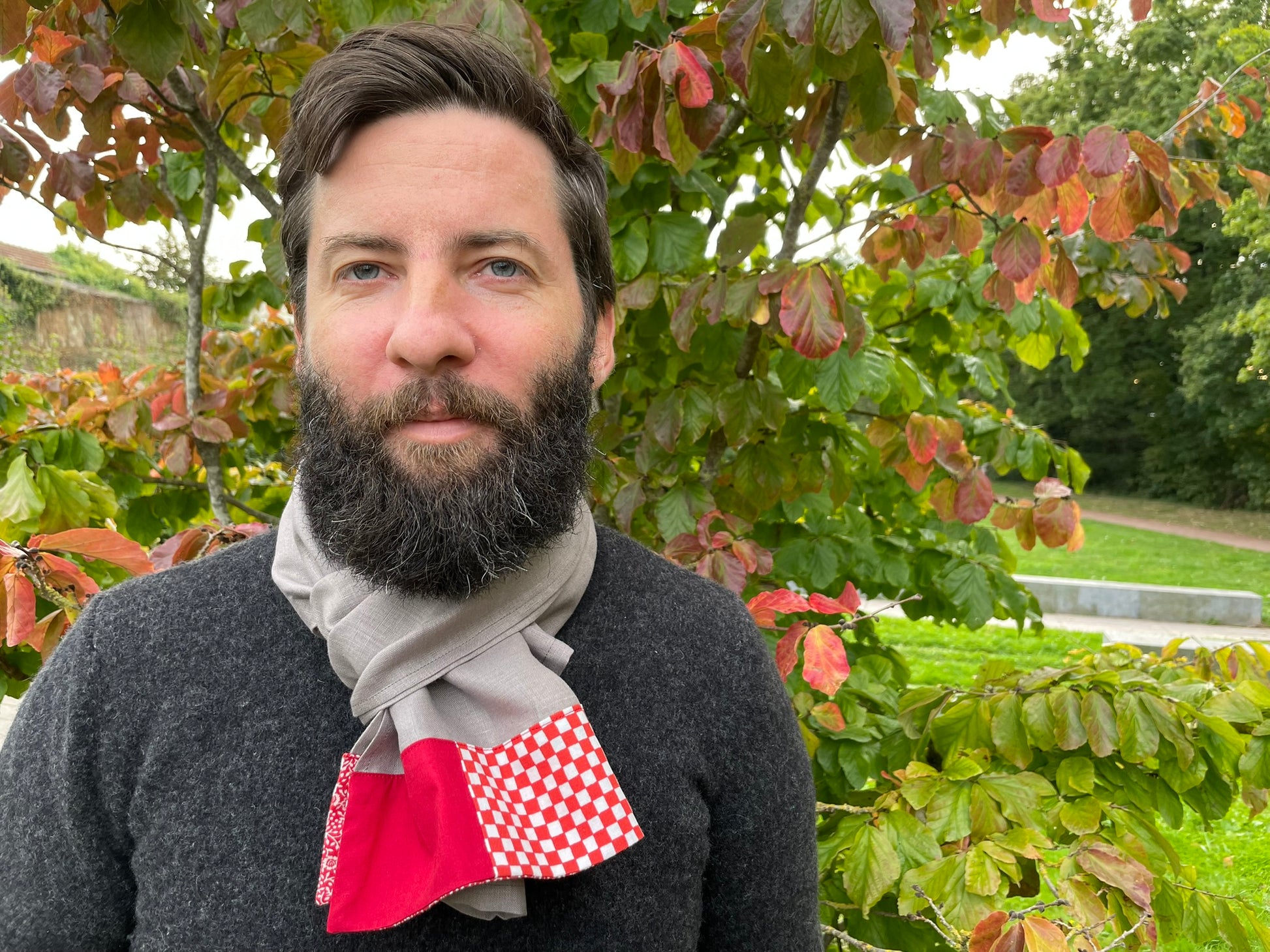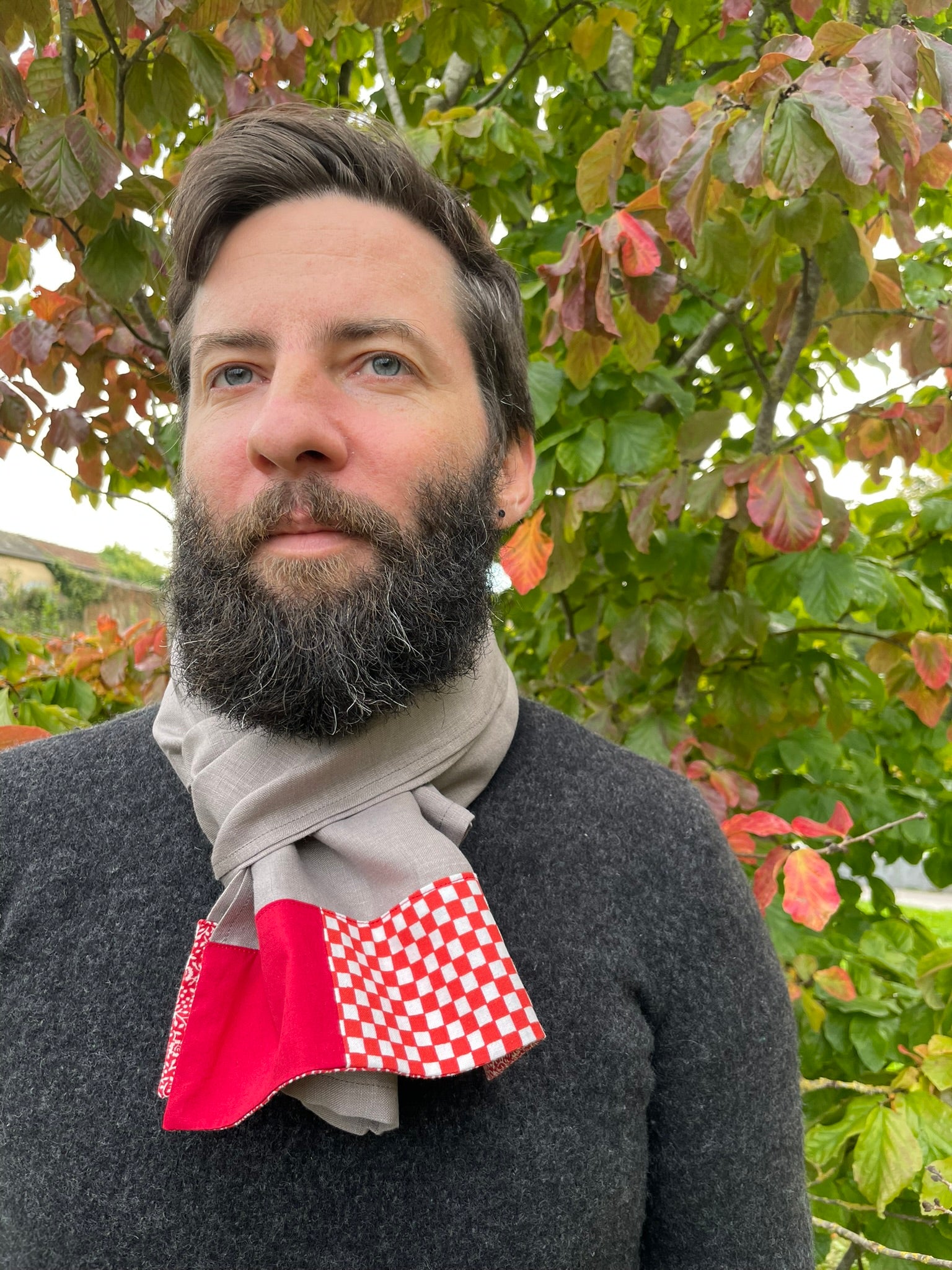 Chèche homme (ou mixte car un foulard est-ce vraiment genré ?) en lin gris clair, bande de tissus différents, esprit un peu patchwork, à une des extrémités, dans les tons rouge et blanc.