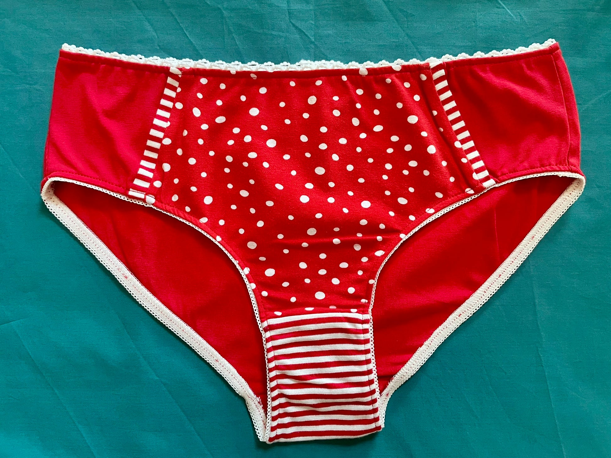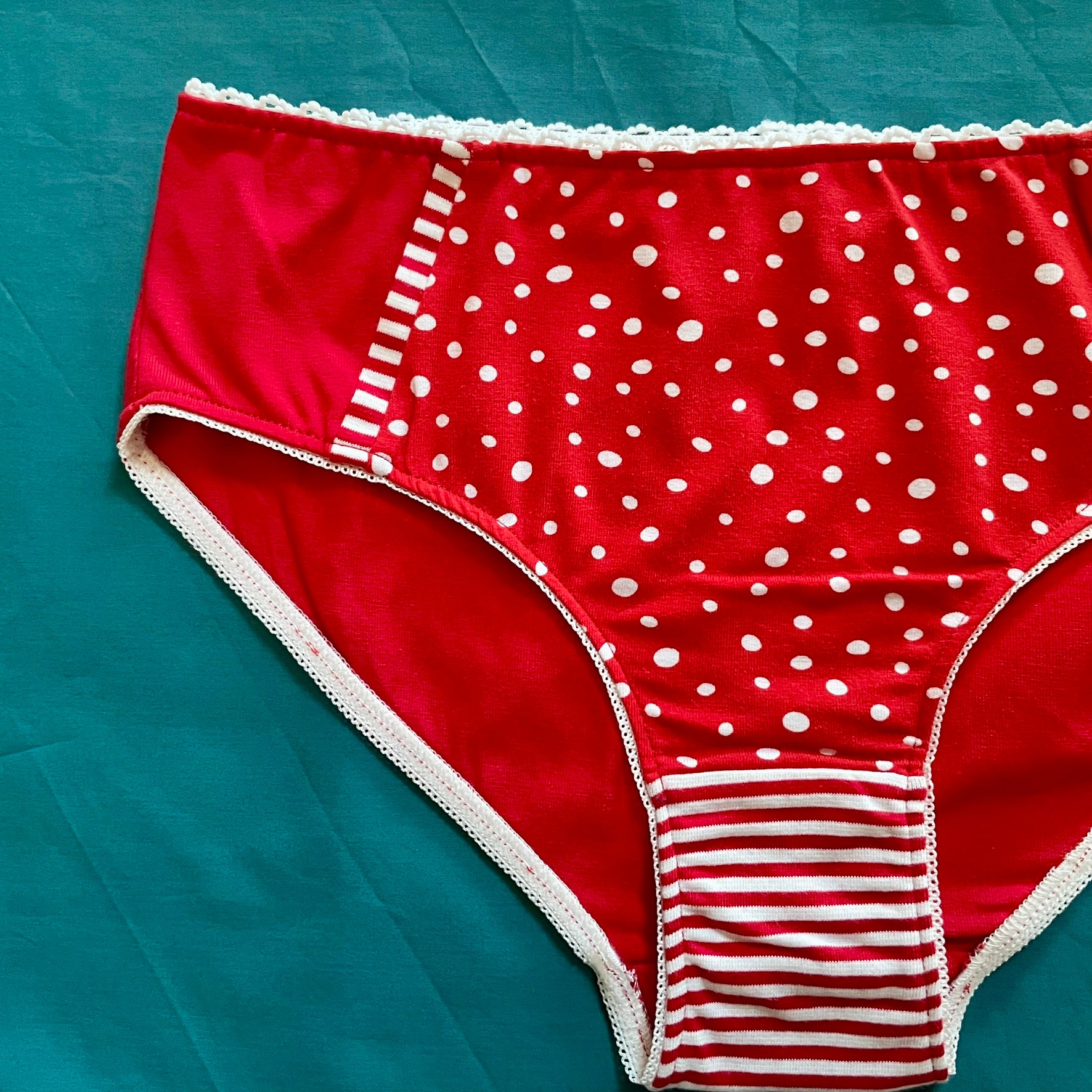 Culotte femme en coton et élasthanne. Modèle rouge et blanc pois et à rayures