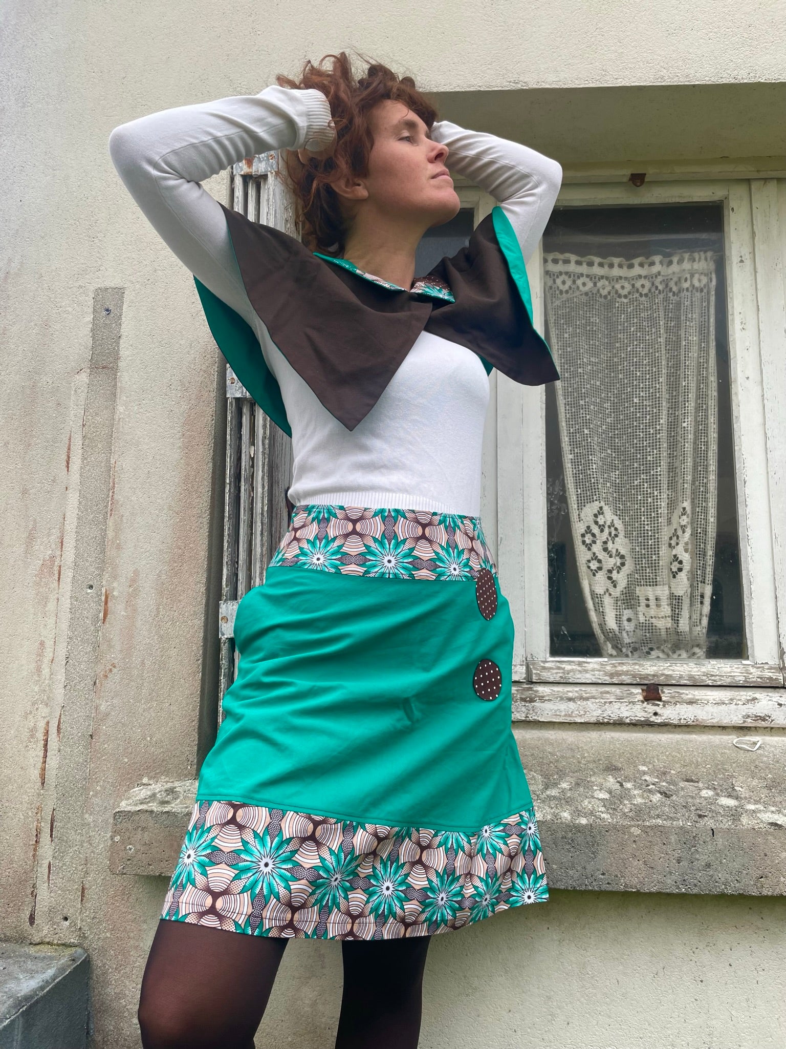 Jupe en coton vert ; empiècements à motifs type wax tons vert, beige et marron en haut et en bas de la jupe. Deux poches dans les coutures latérales (parce que c'est trop bien d'avoir des poches)