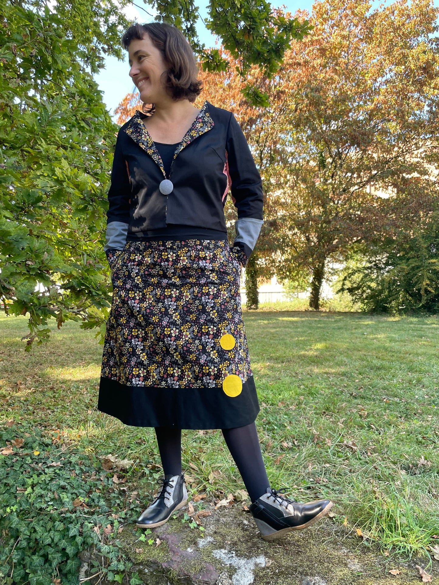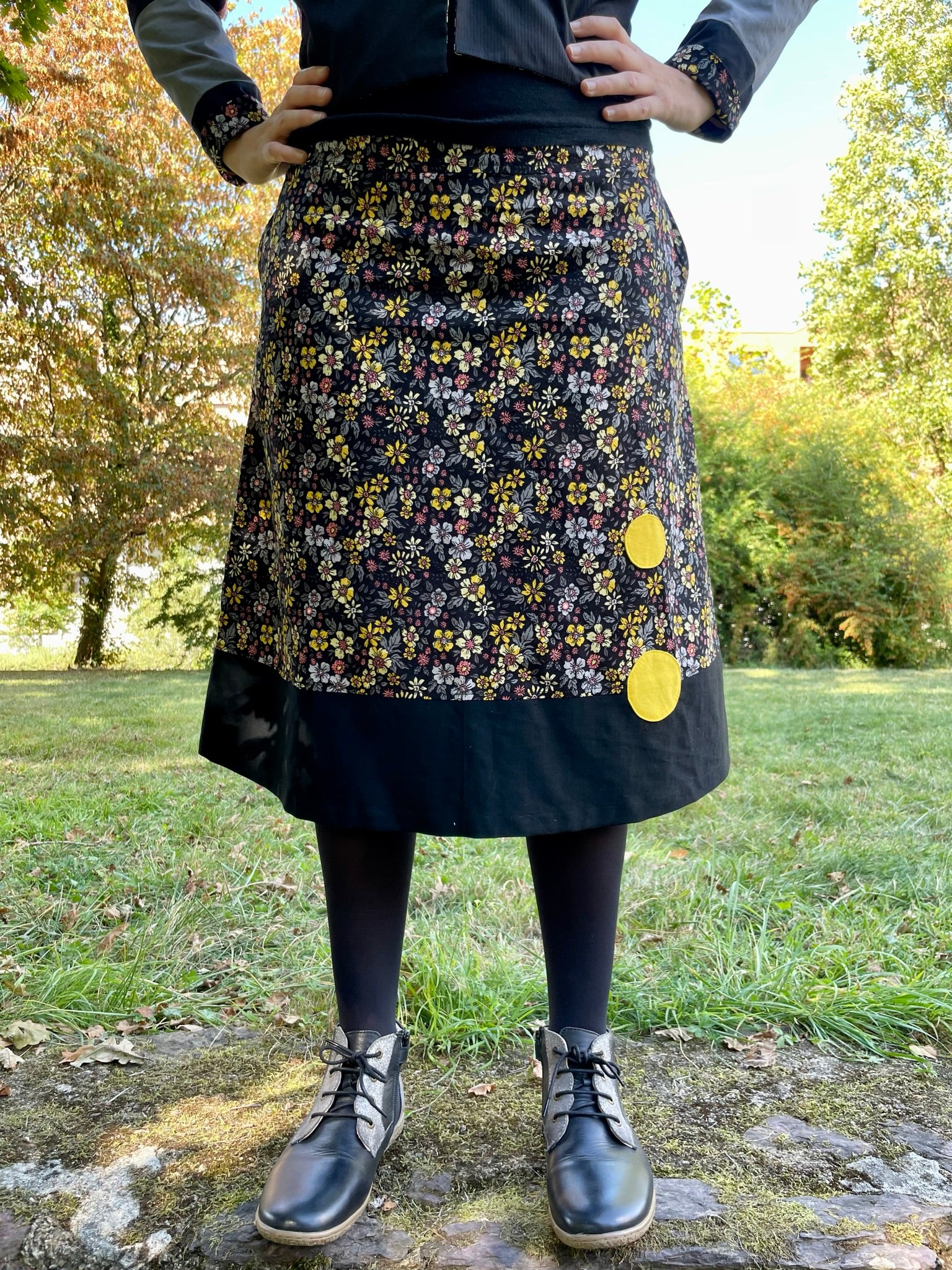 Jupe midi en coton noir à petites fleurs jaune, rose et gris ; empiècement noir en bas de la jupe. Deux poches dans les coutures latérales.