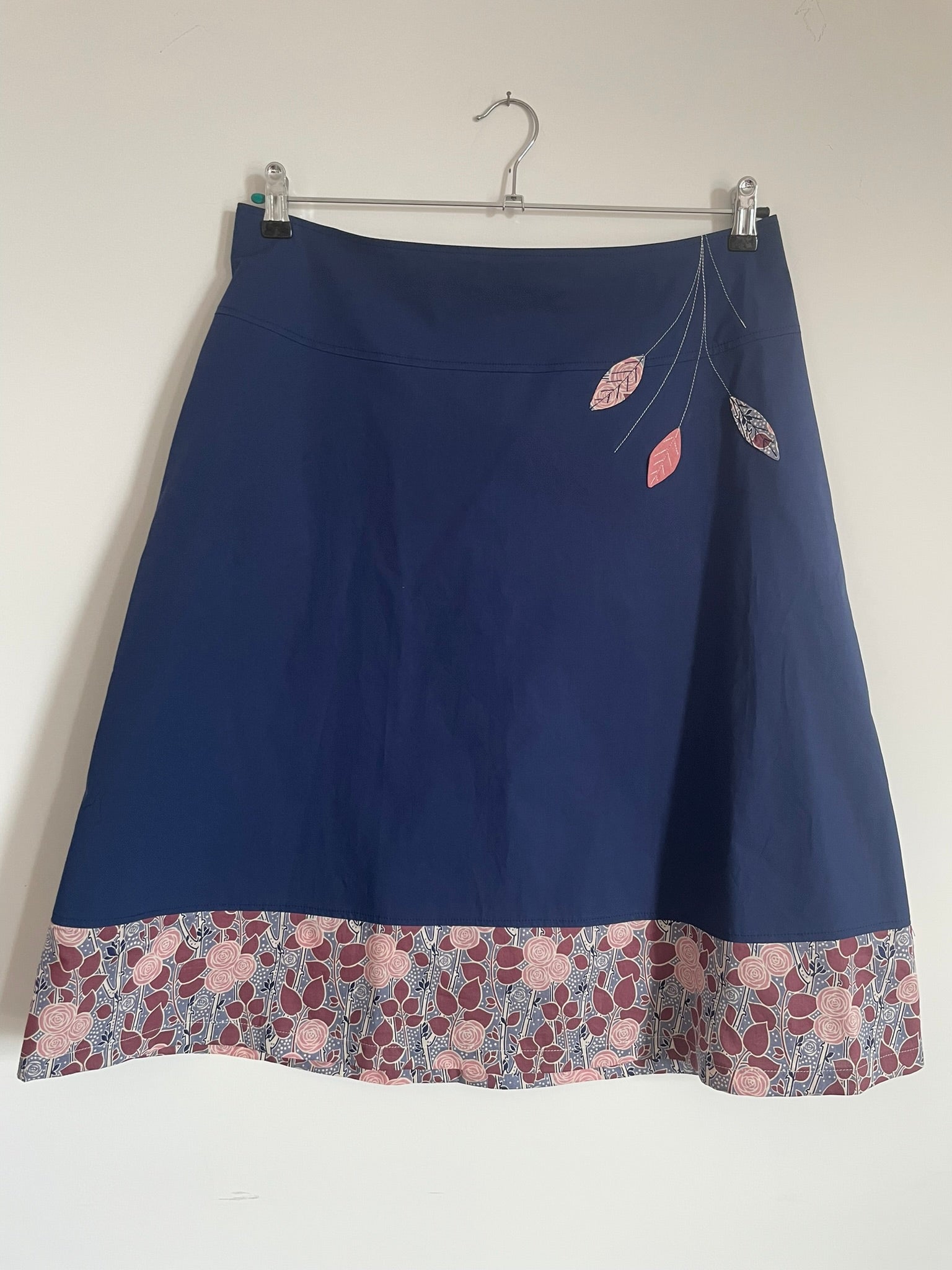 Jupe midi en coton bleu foncé ; empiècement à motif fleuri (roses) en bas de la jupe. Deux poches dans les coutures latérales.