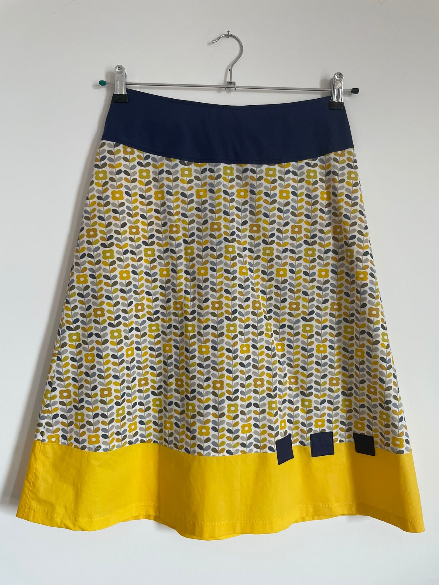 Jupe midi en coton à fleurs et tiges jaune, bleu et gris sur fond blanc ; empiècement bleu au niveau de la taille et jaune en bas de la jupe. Deux poches dans les coutures latérales.