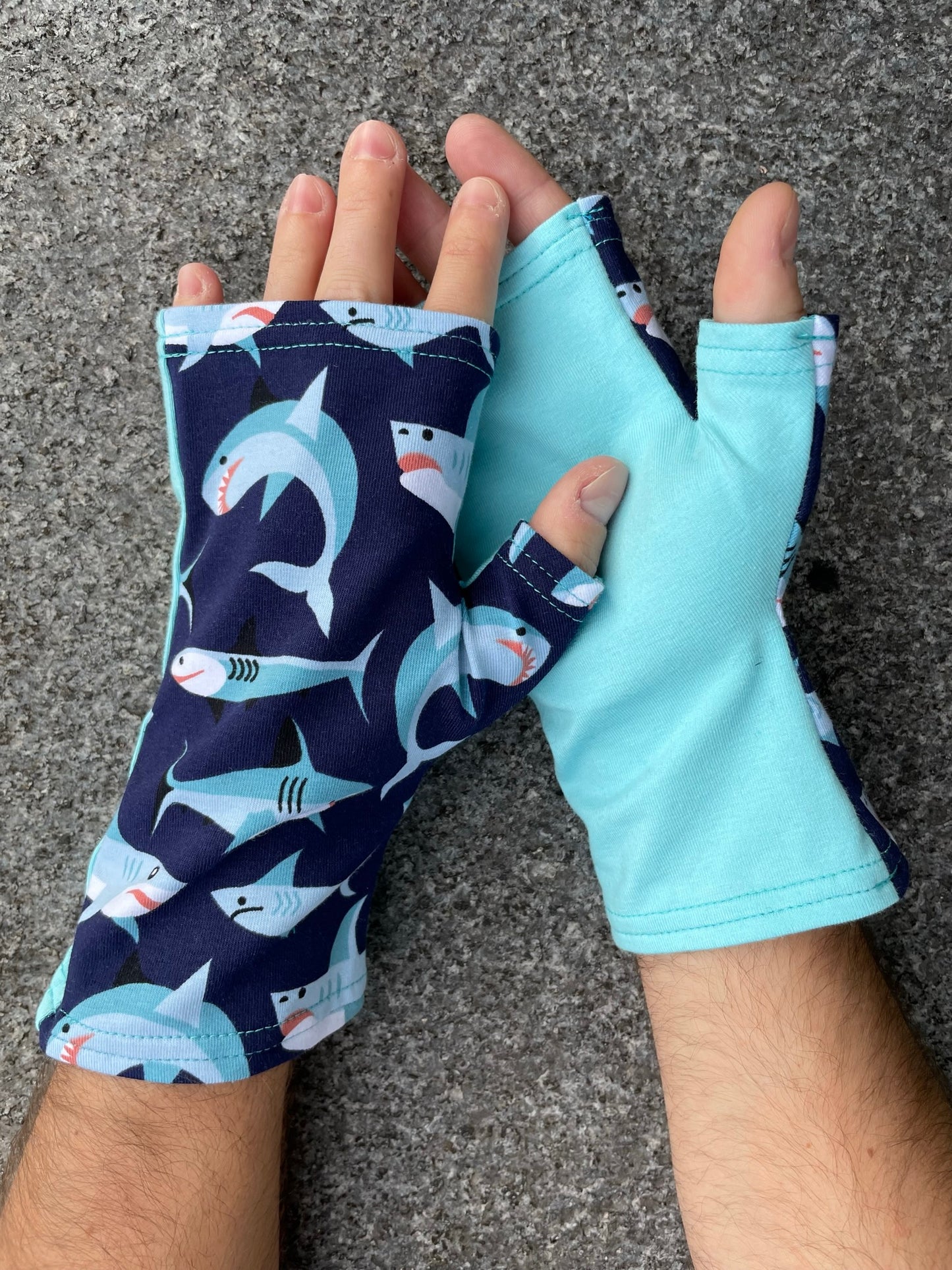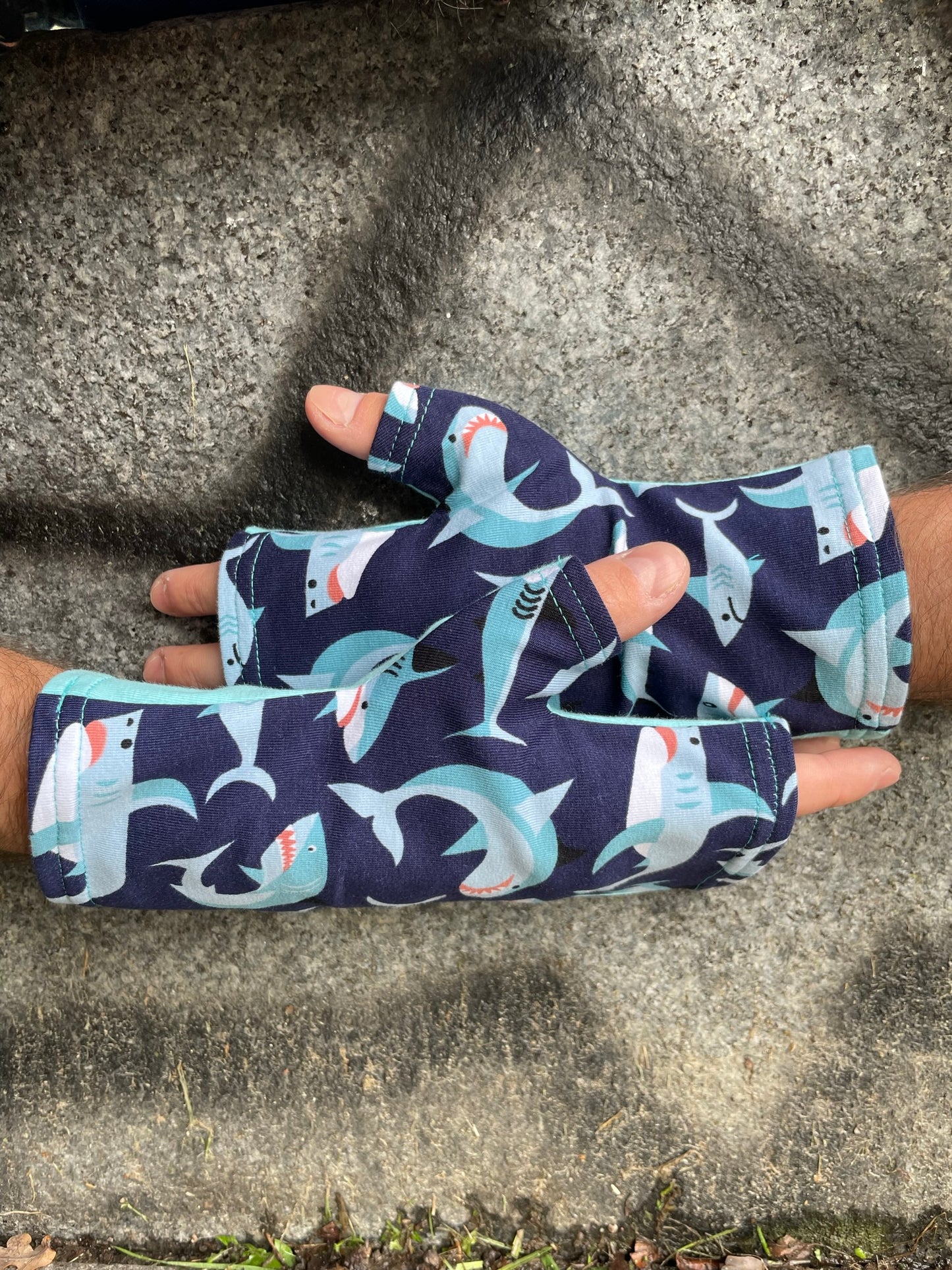 Mitaines à pouces en jersey de coton : bleu clair et motifs requins (féroces!) sur fond bleu marine.