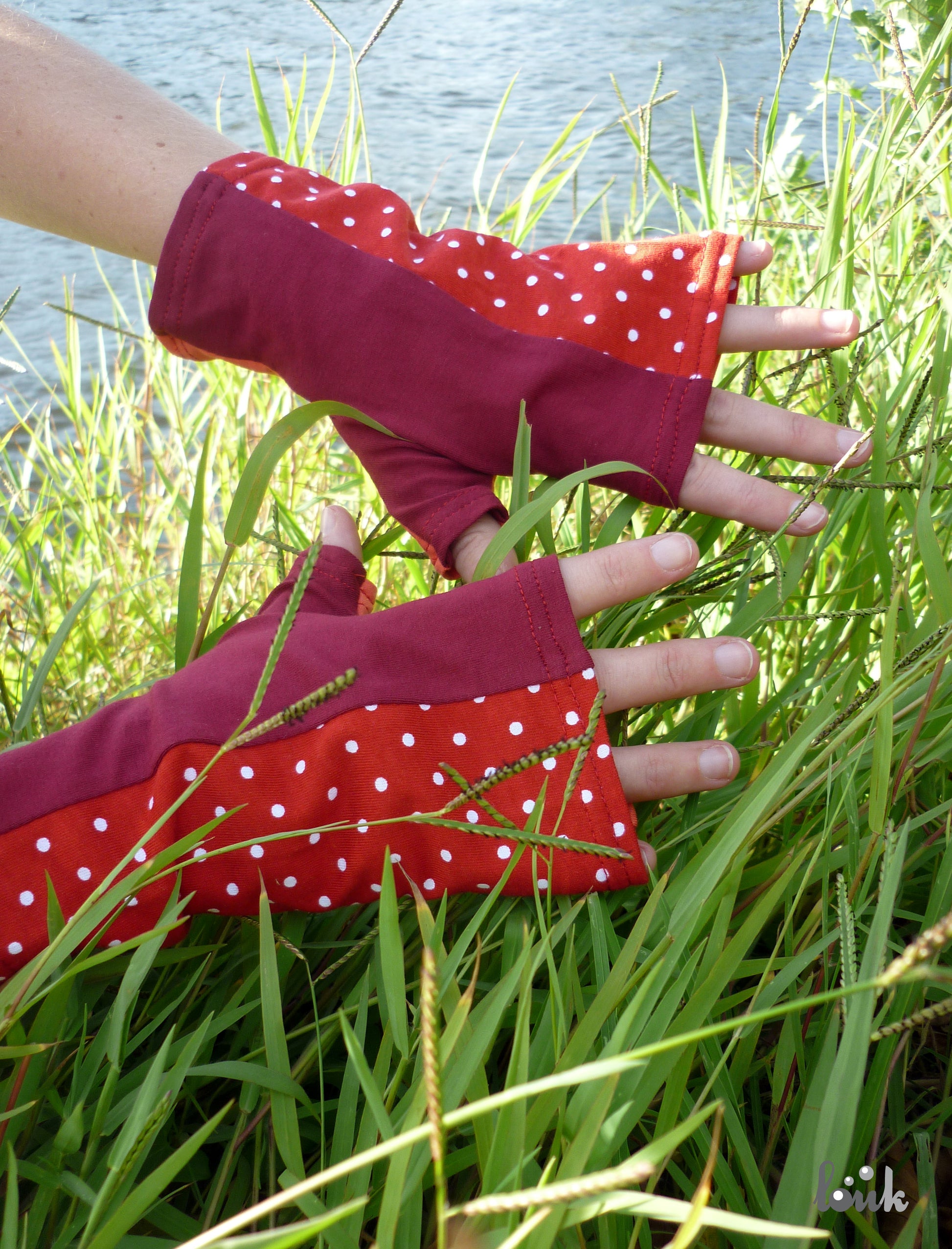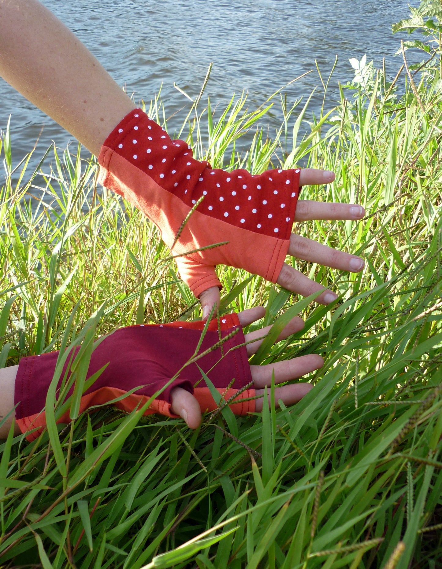 Mitaines à pouces en jersey de coton et viscose : rouge à petits pois, bordeaux et corail.