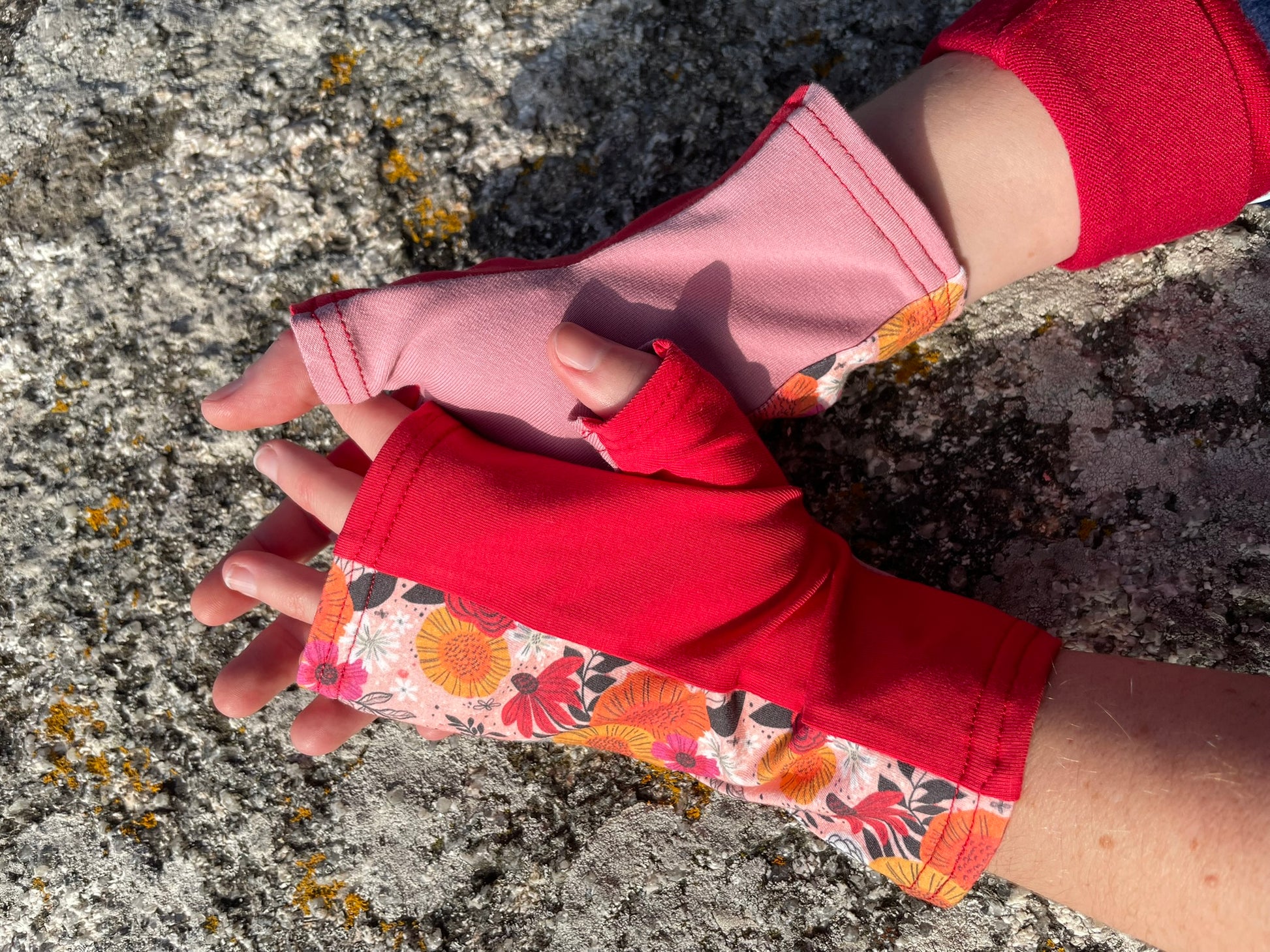 Mitaines à pouces en jersey de coton : rouge, rose et joli motif à fleurs.