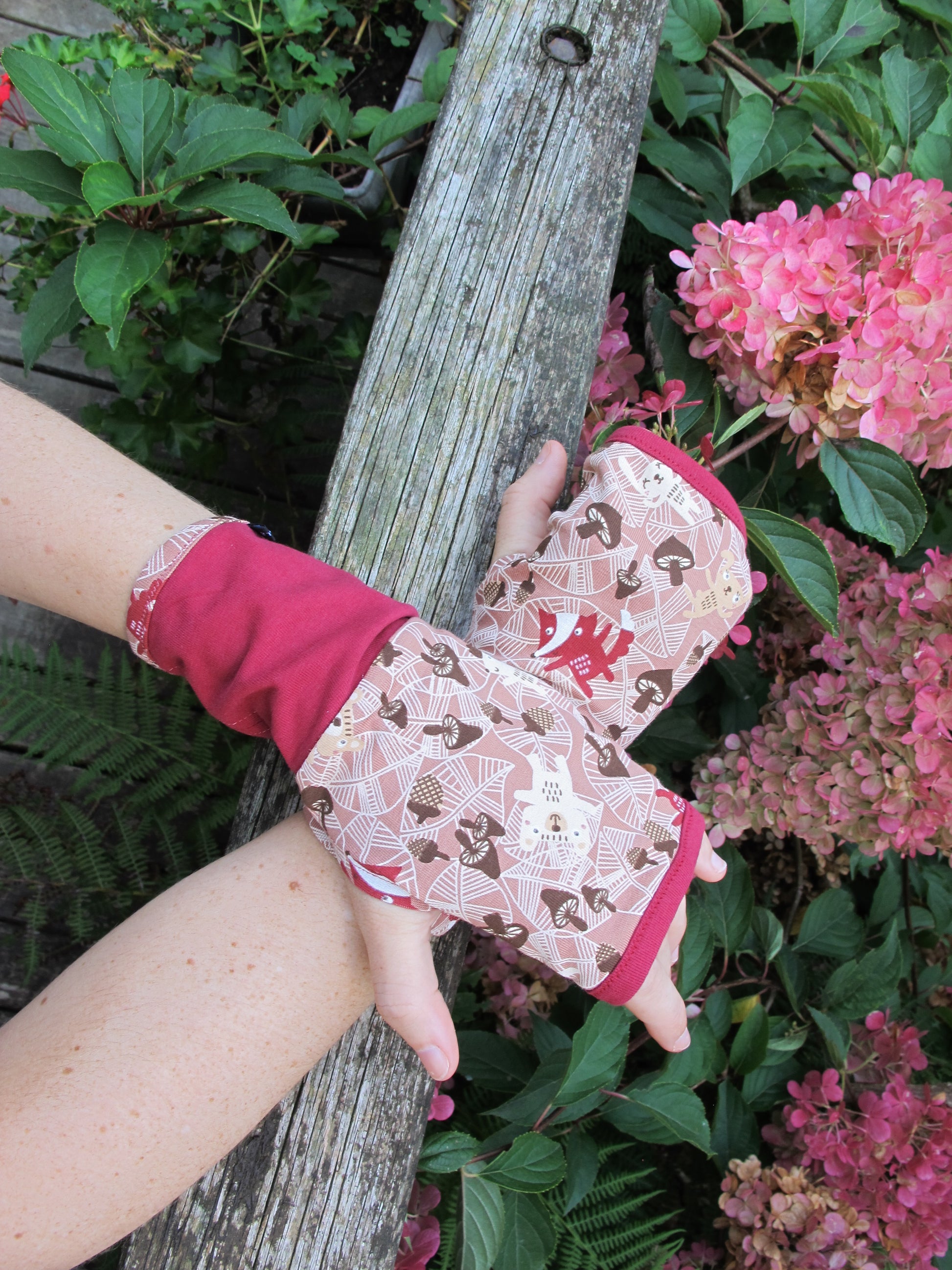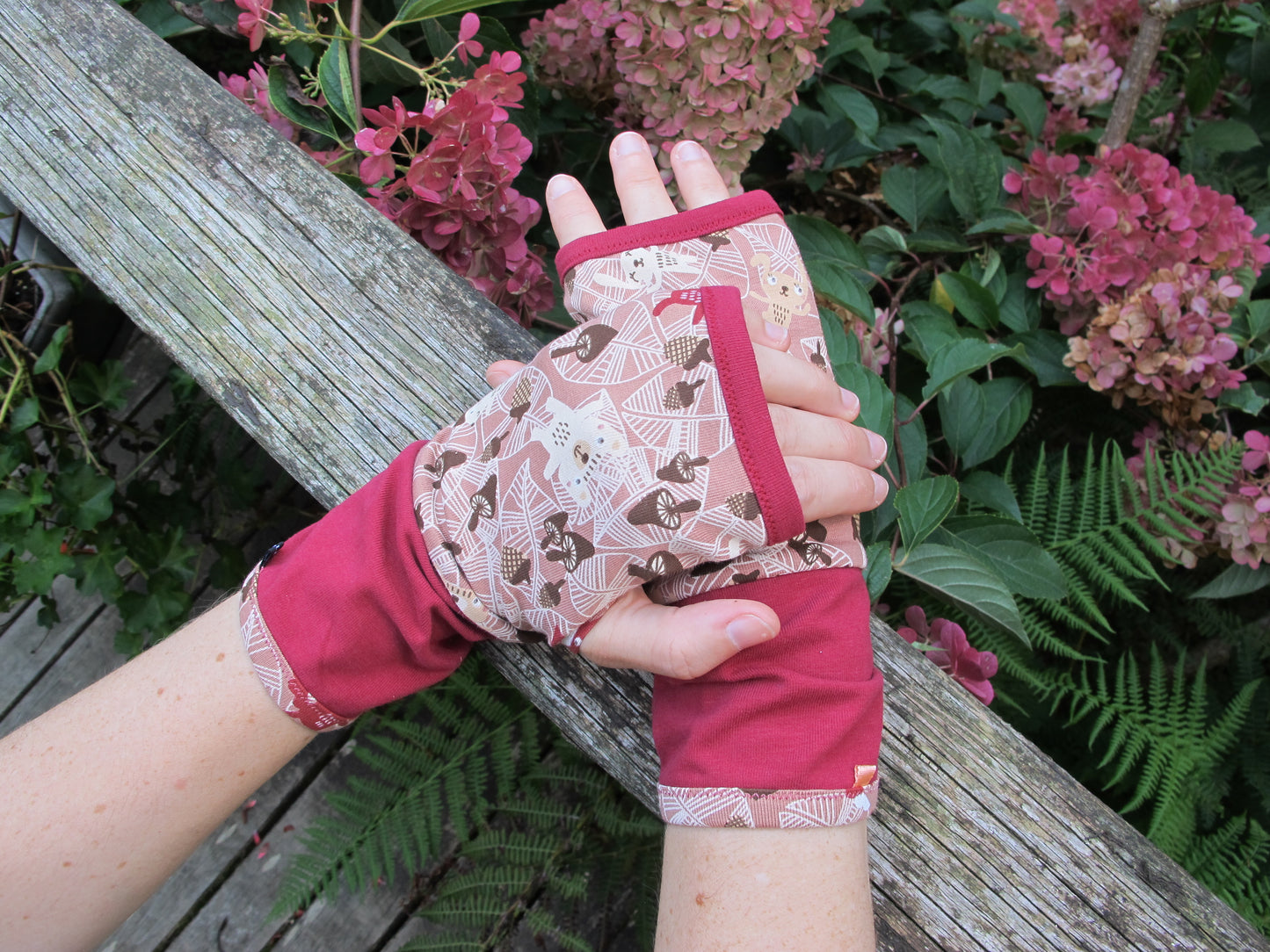 Mitaines mi-saison en jersey de coton rouge foncé et motifs renards et champignons sur fond vieux rose.