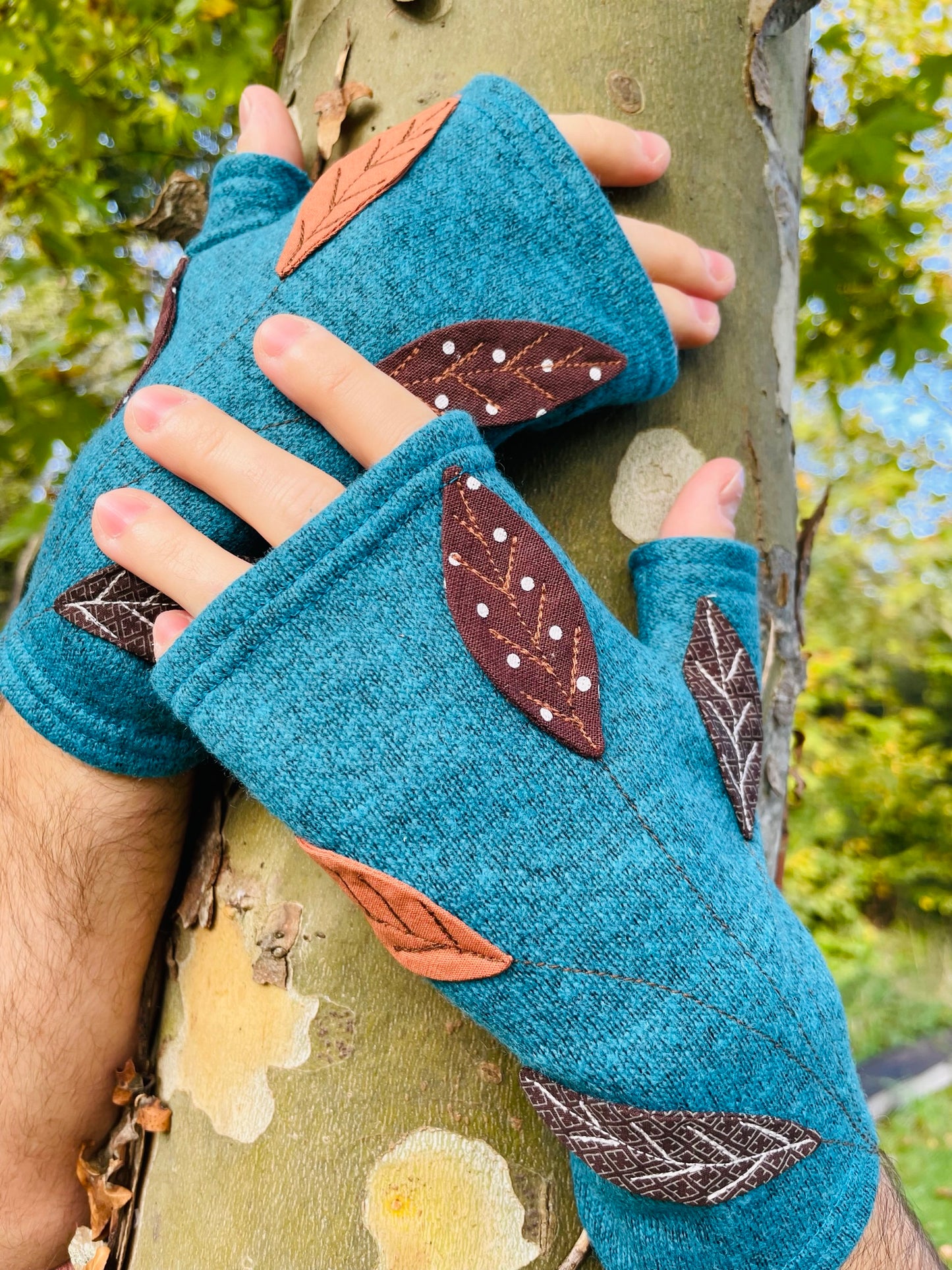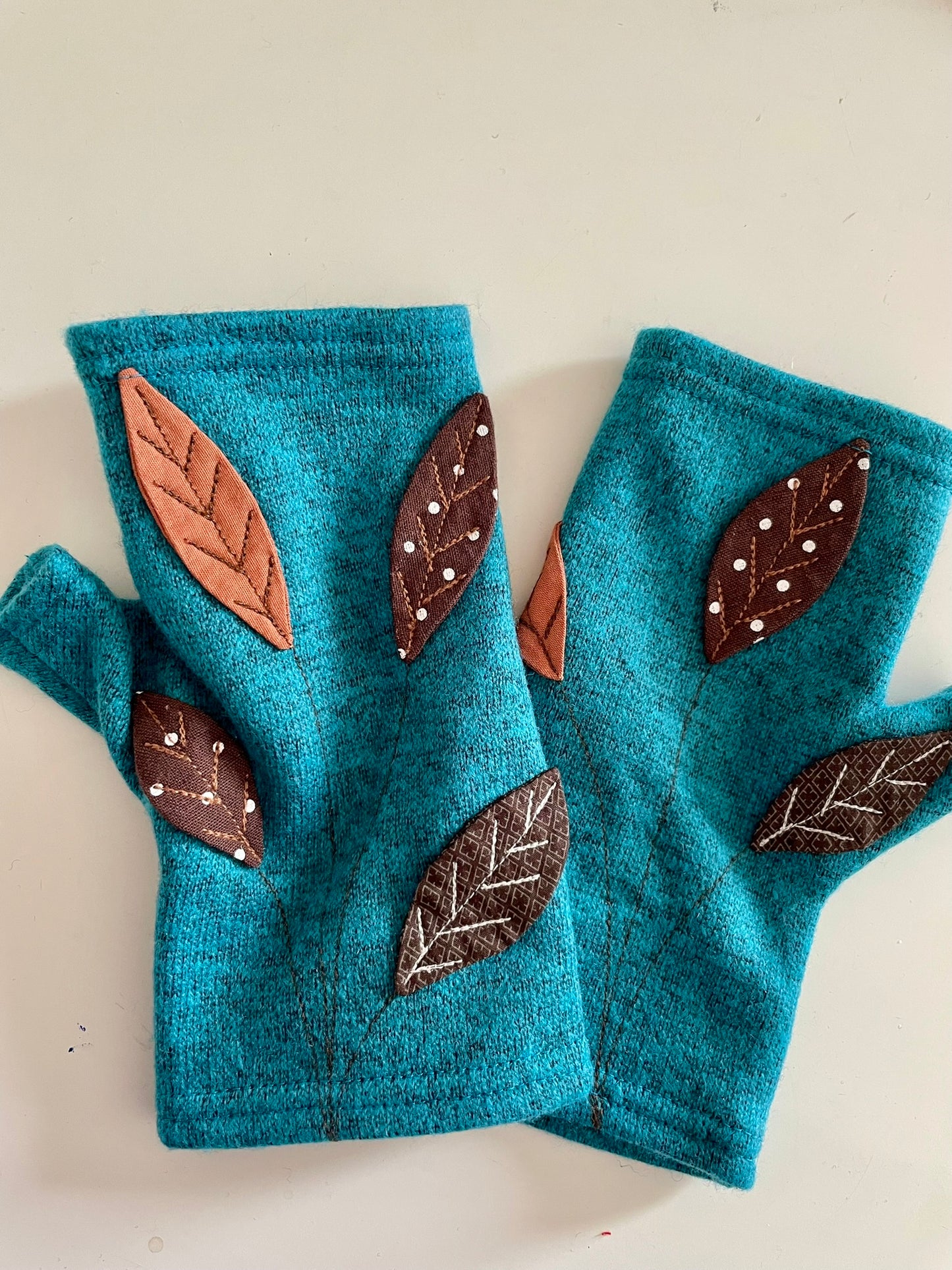 Mitaines à pouces en jersey de laine bleu turquoise, motifs feuillages dans un camaïeu de bruns en appliqués.