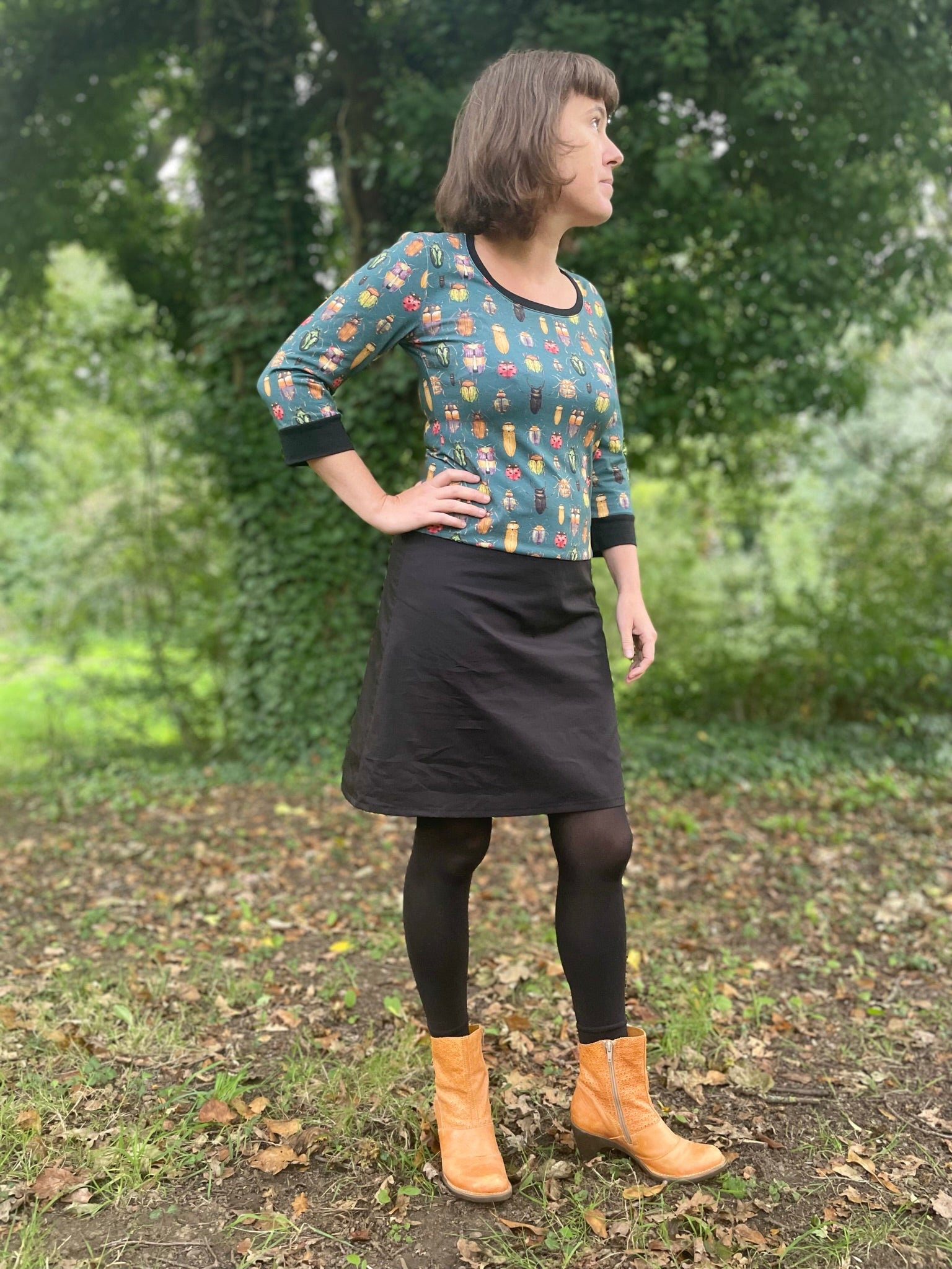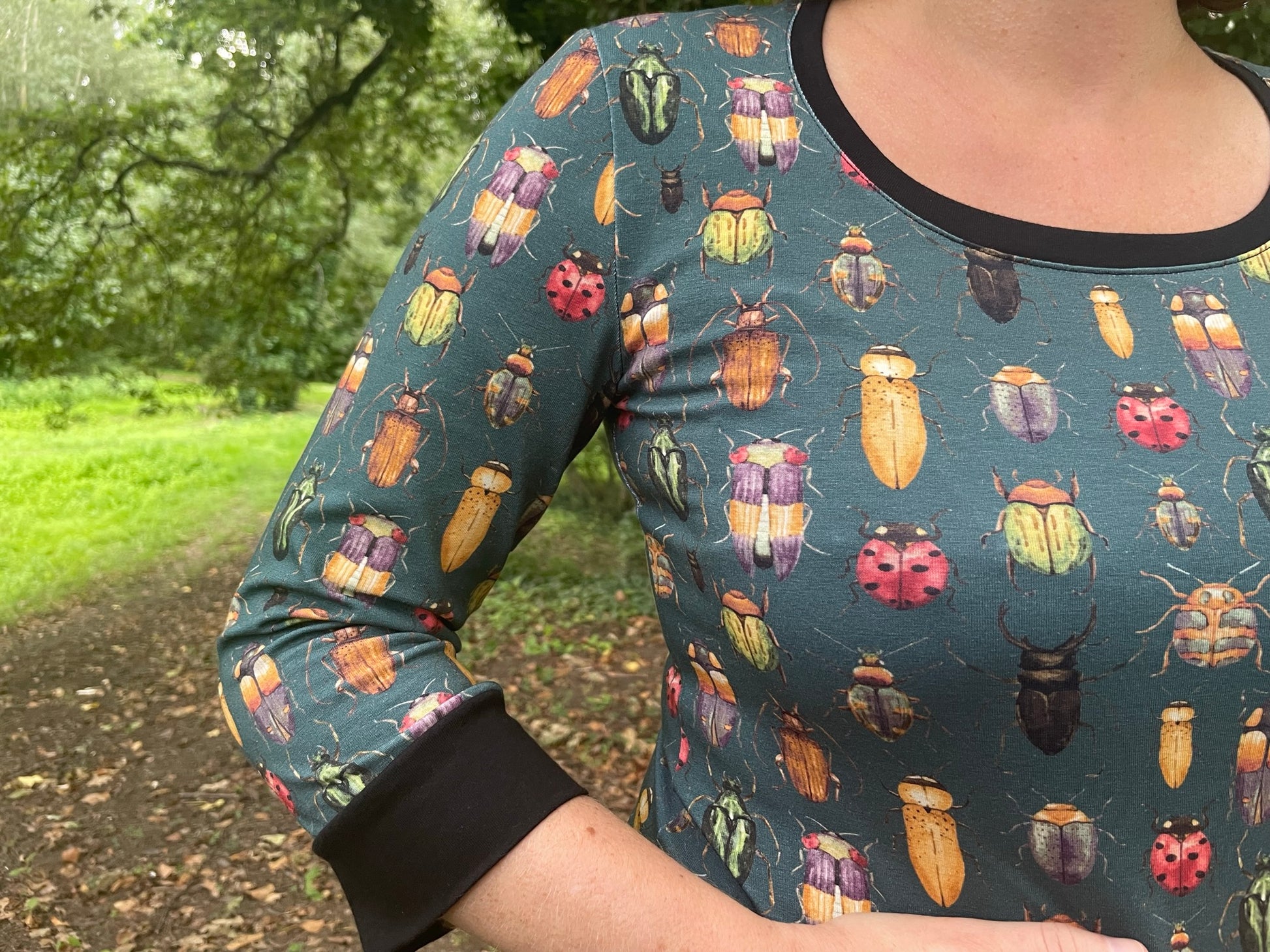 Le haut est en jersey de coton souple à motifs insectes (scarabées, coccinelles...) sur fond vert foncé, liseré noir à l'encolure et en bas des manches (3/4)