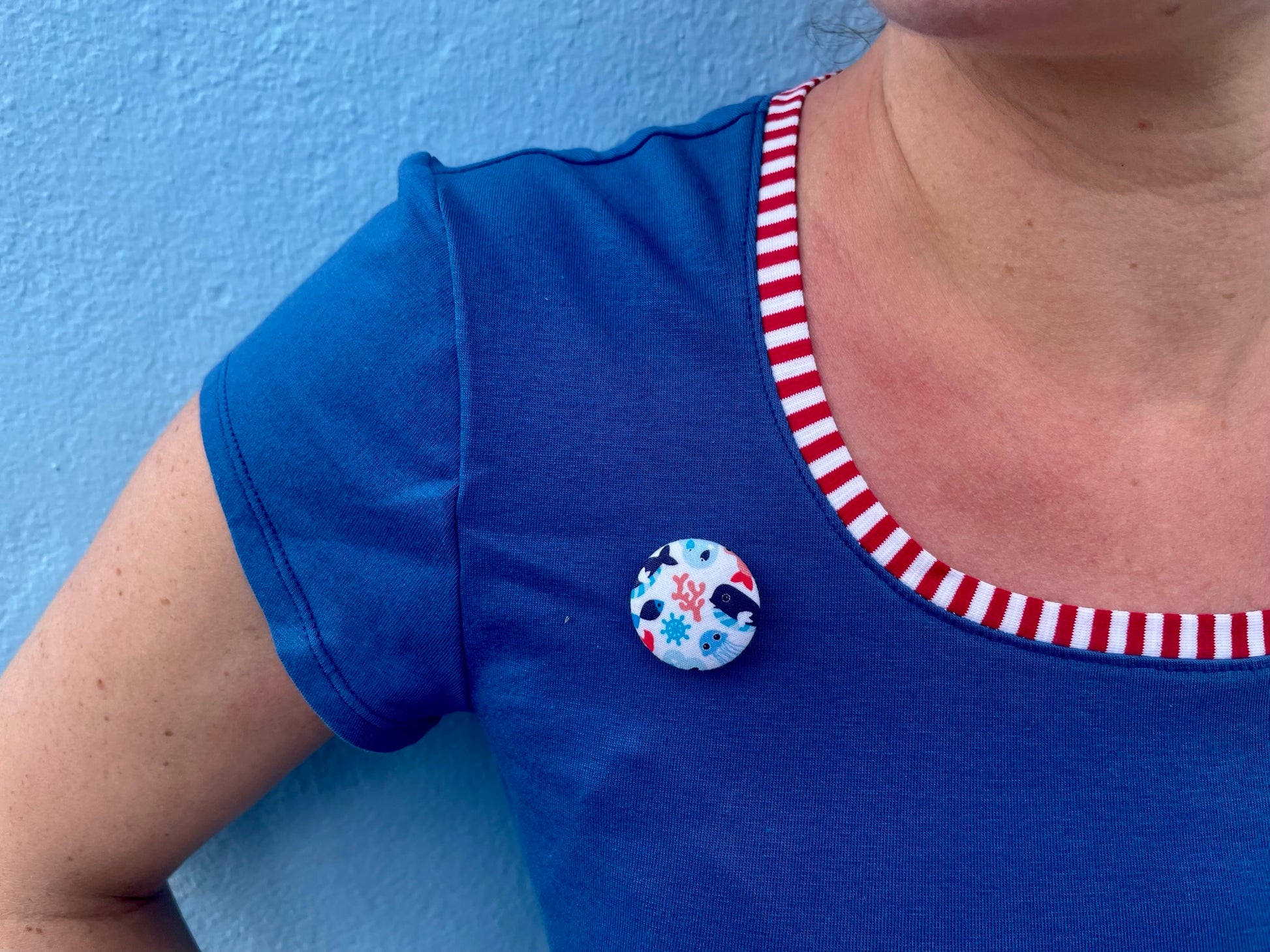 Le haut est en jersey de coton souple bleu, liseré rayé rouge et blanc à l'encolure, petites manches courtes.