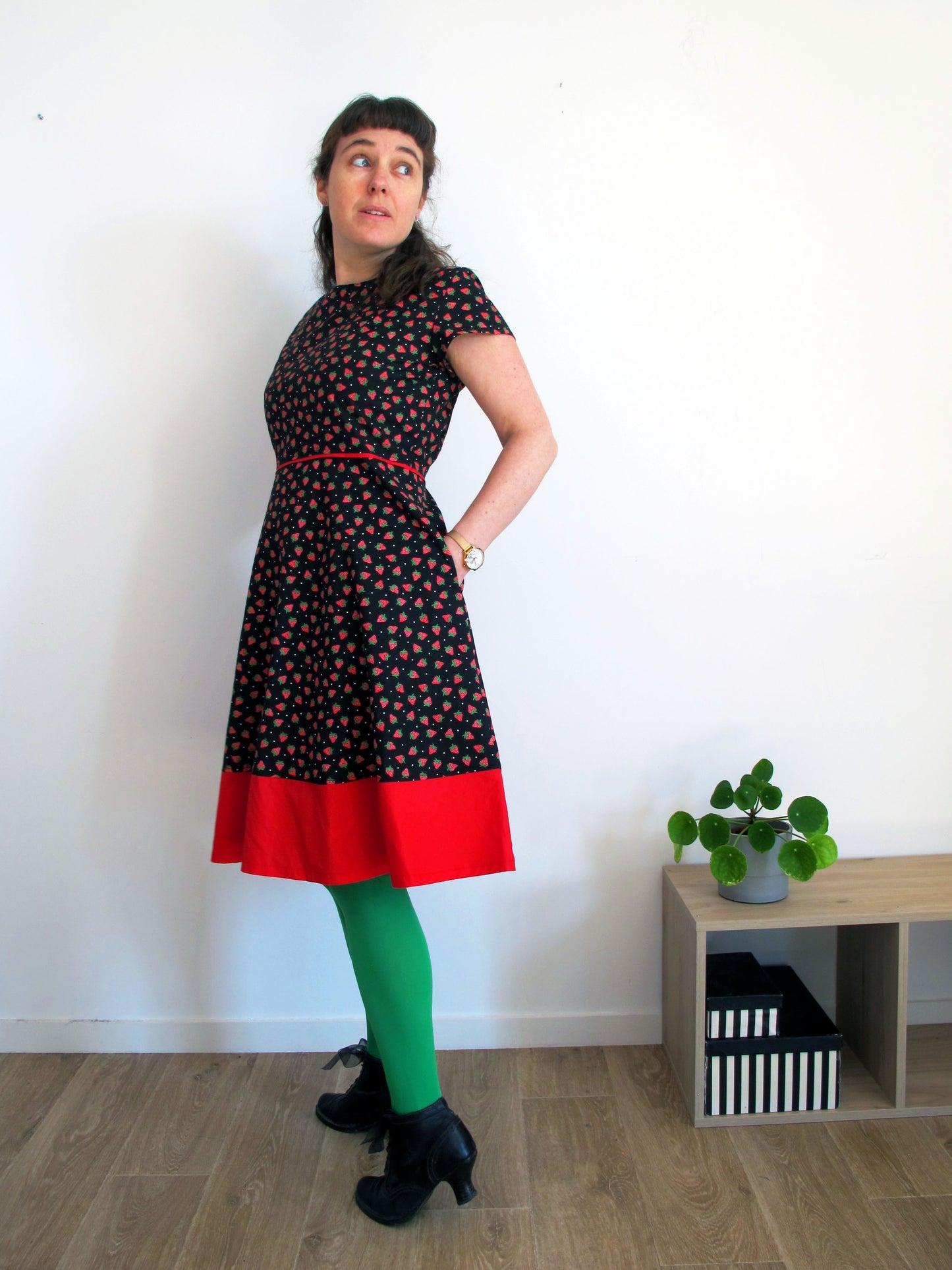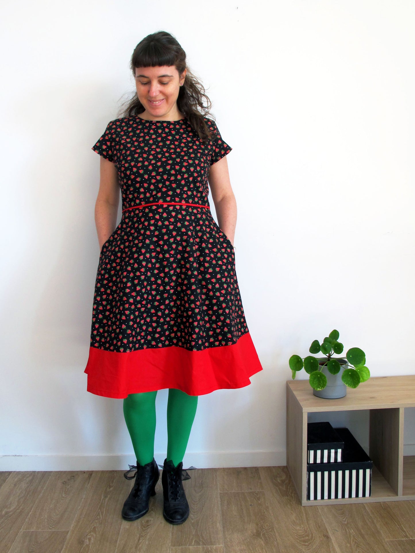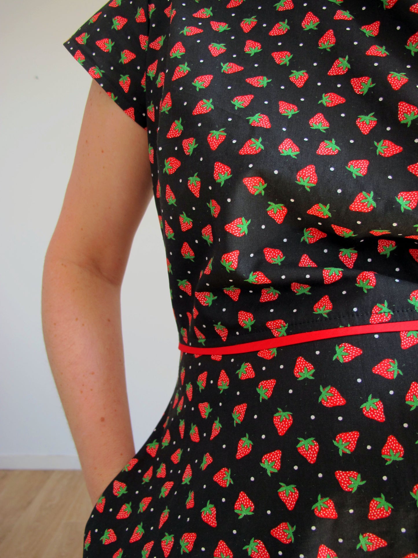 Robe en coton noir à motifs fraises, manches courtes, encolure arrondie, coupe cintrée, découpe à la taille puis partie basse très évasée (elle tourne, c'est une robe pour danser !).