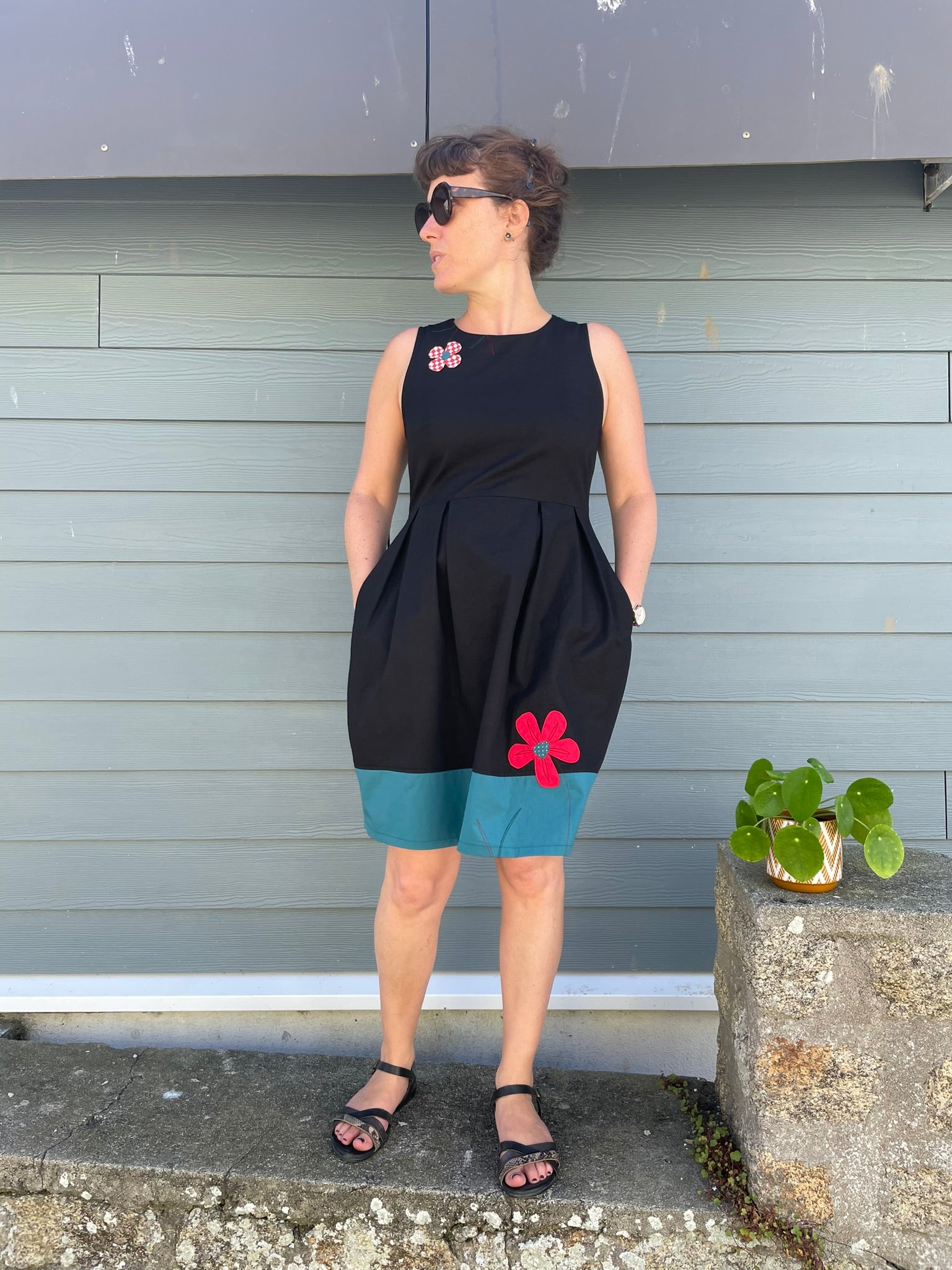 Bande de tissu bleu canard en bas de la jupe, appliqués fleurs dans les tons rouge et canard à l'encolure et en bas de la robe.