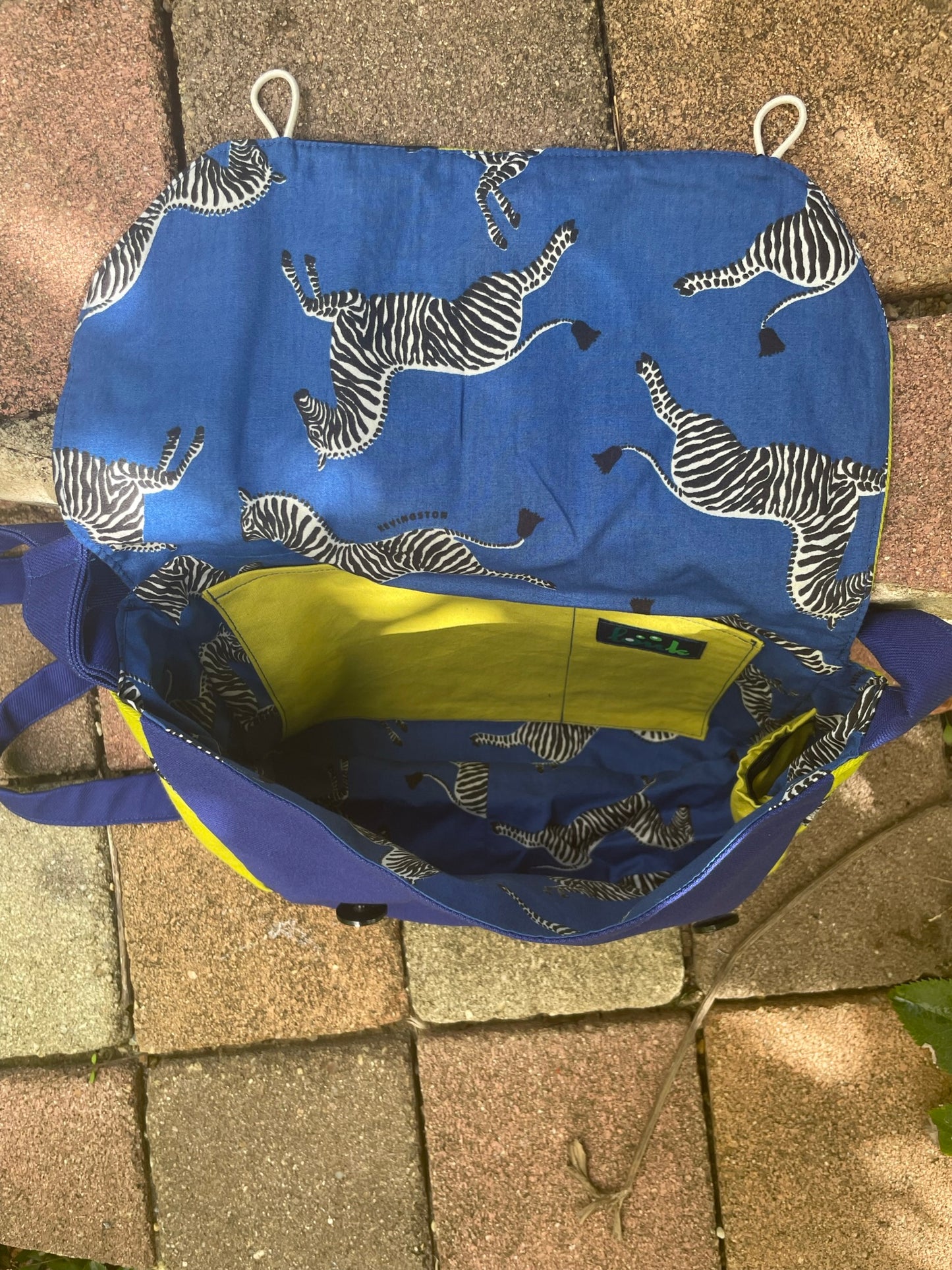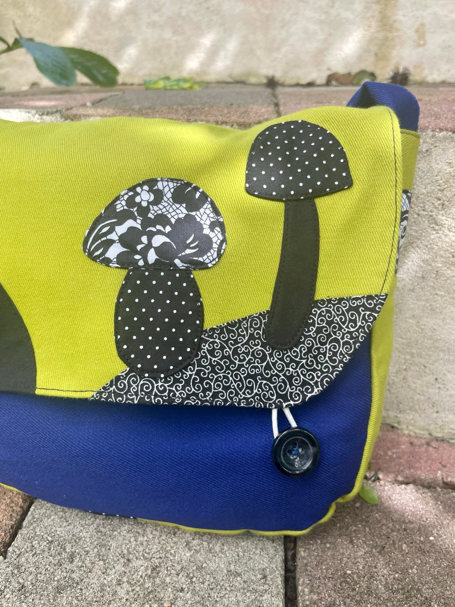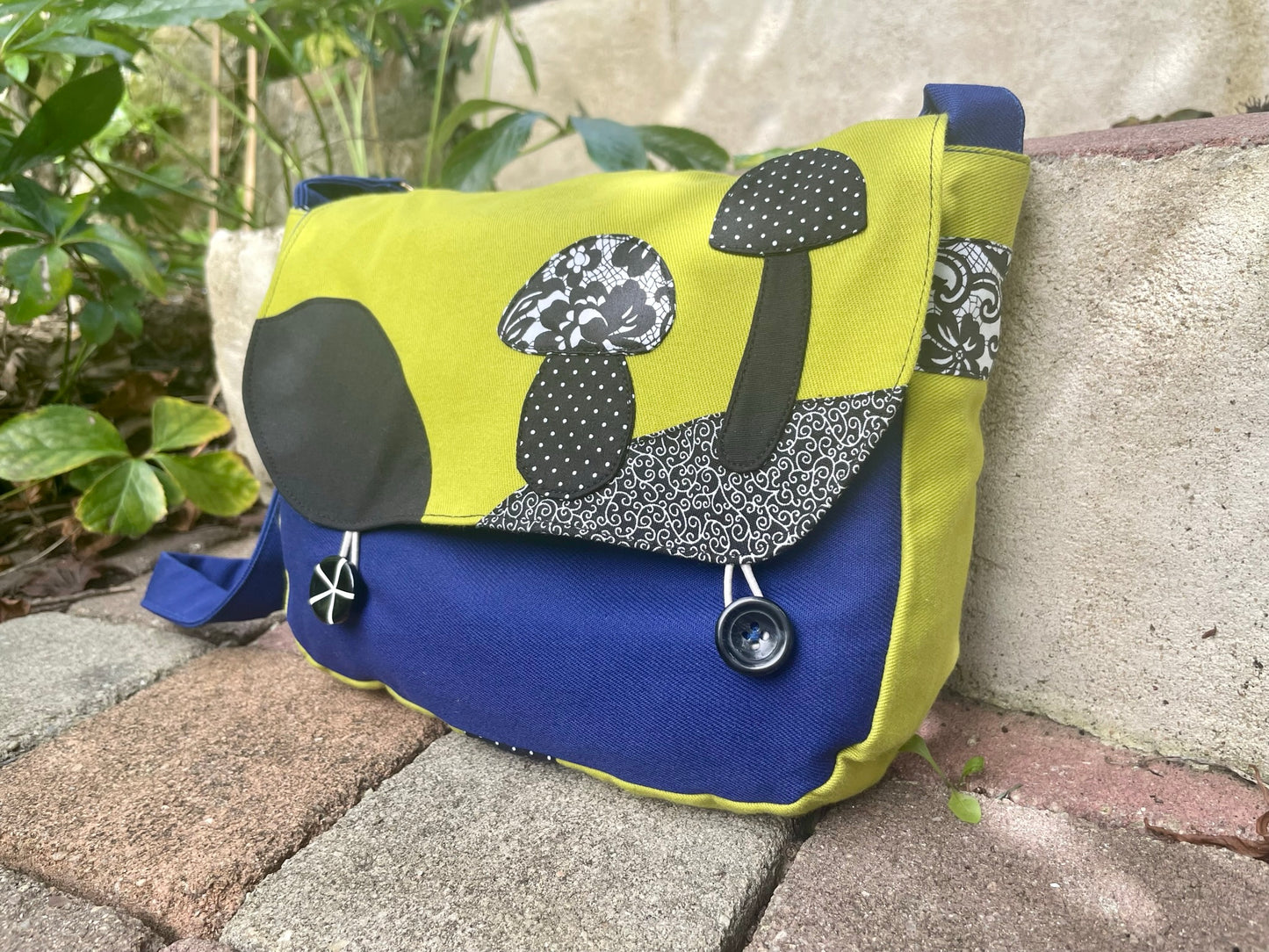 Sac en gabardine de coton (coton épais) à porter à l'épaule ou en bandoulière vert anis et et bleu électrique. Rabat fantaisie avec appliqués champignons noir et blanc.