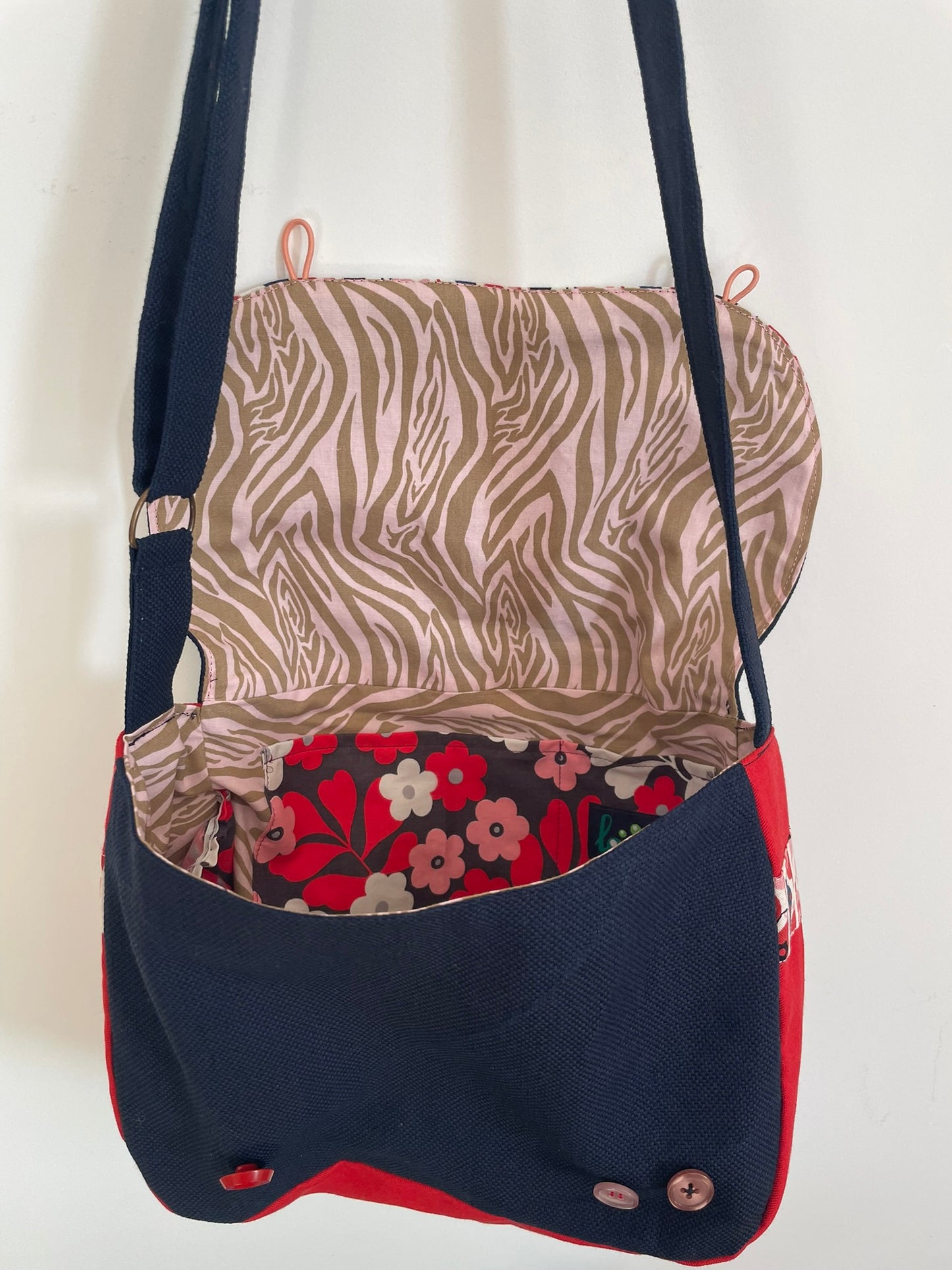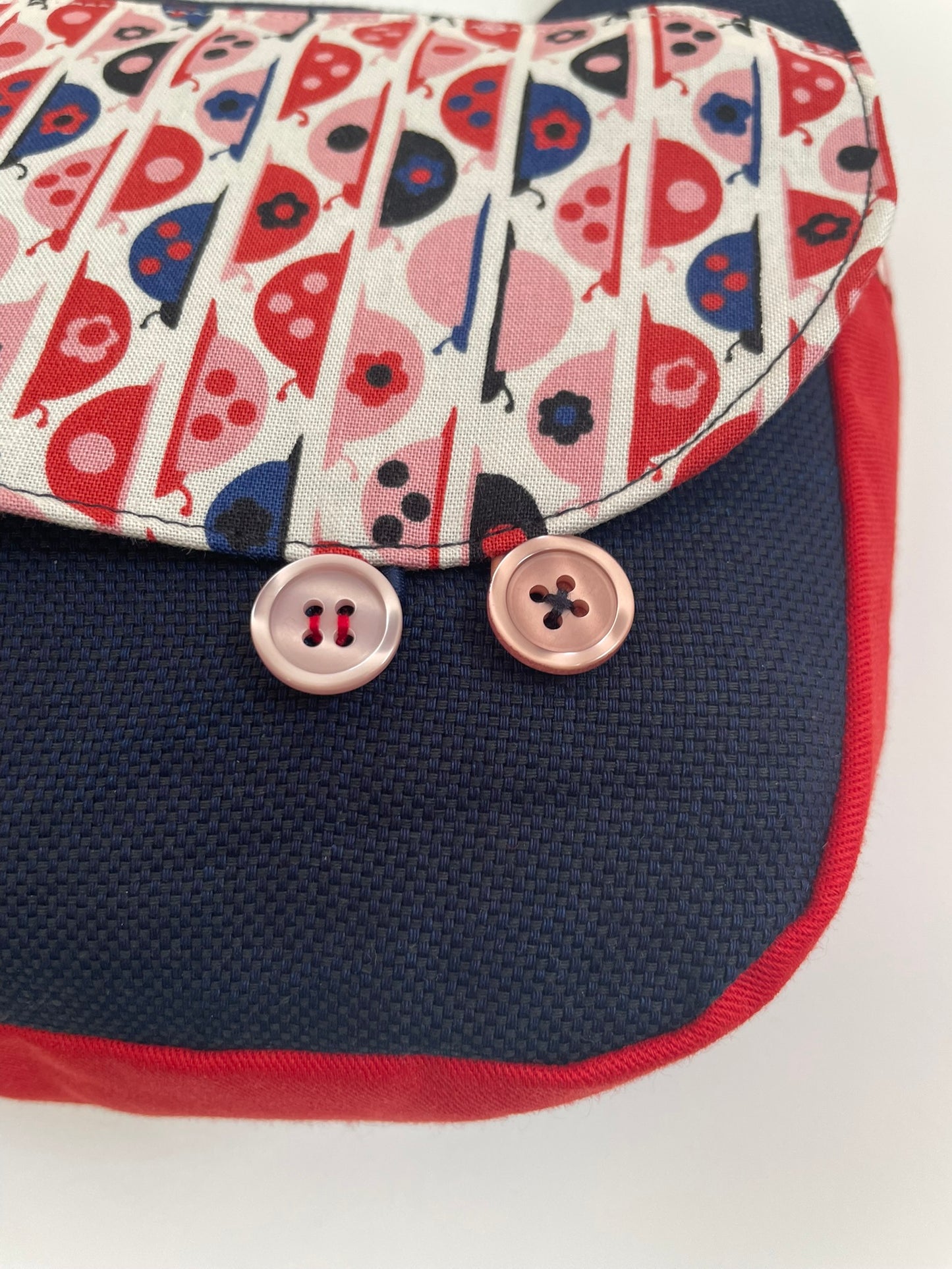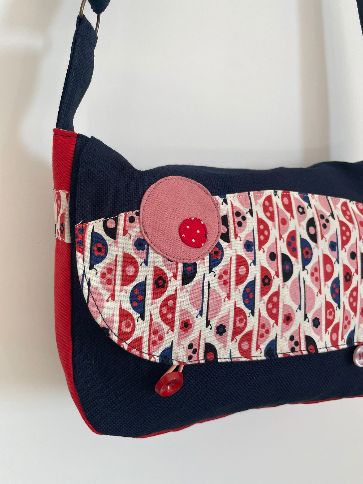 Sac en gabardine de coton (coton épais) à porter à l'épaule ou en bandoulière bleu marine et rouge. Rabat fantaisie avec appliqués à motifs coccinelles.
