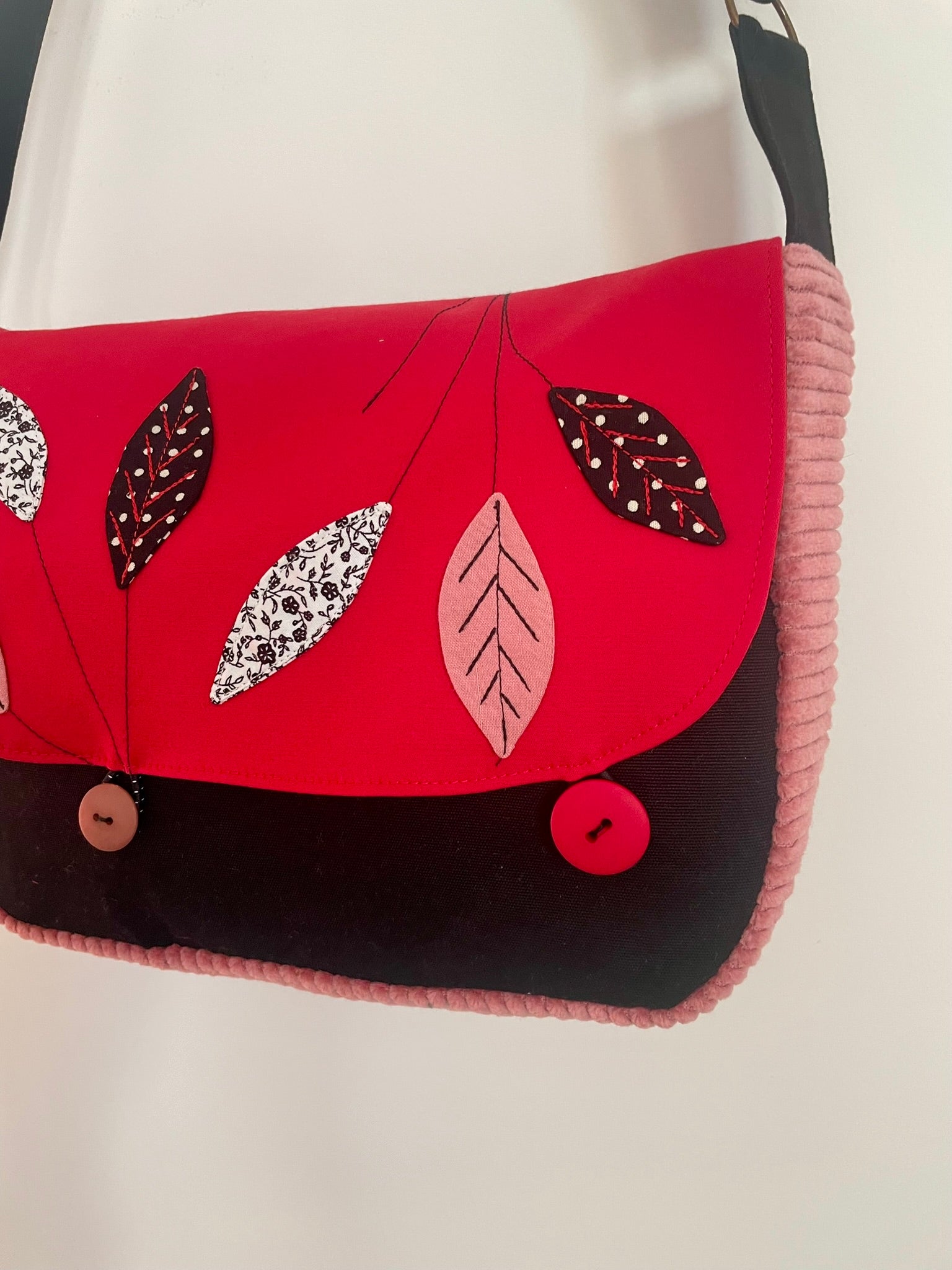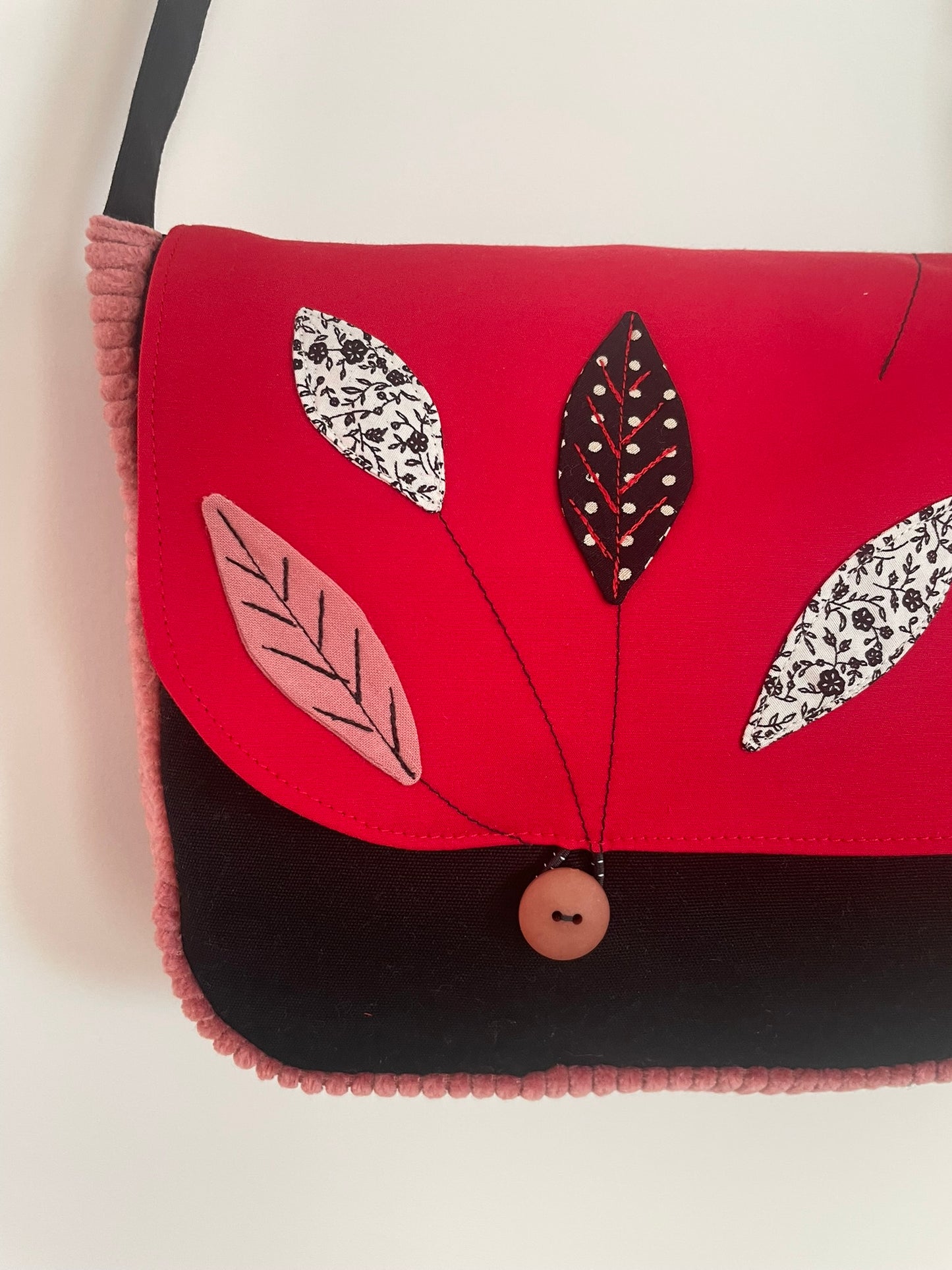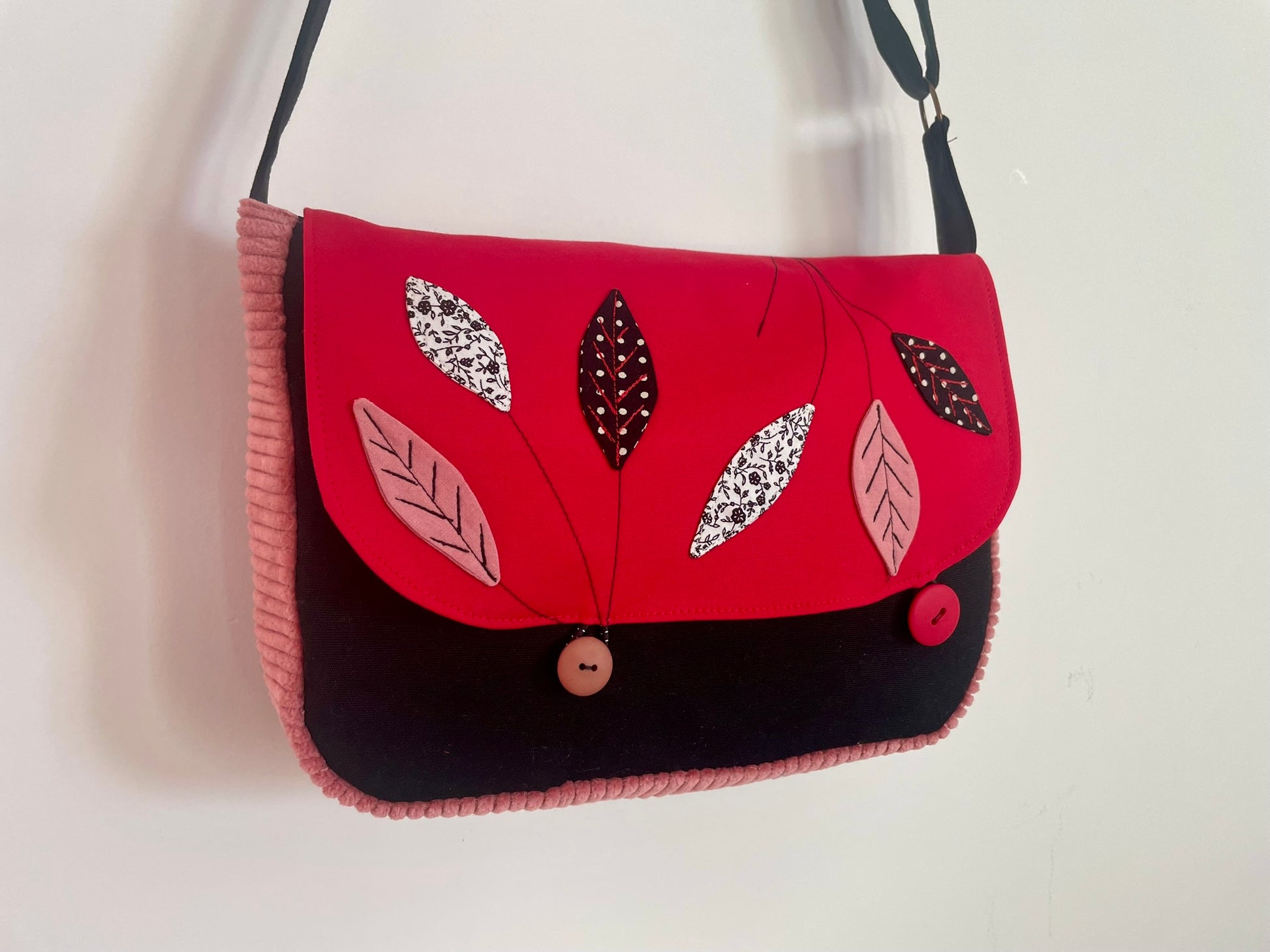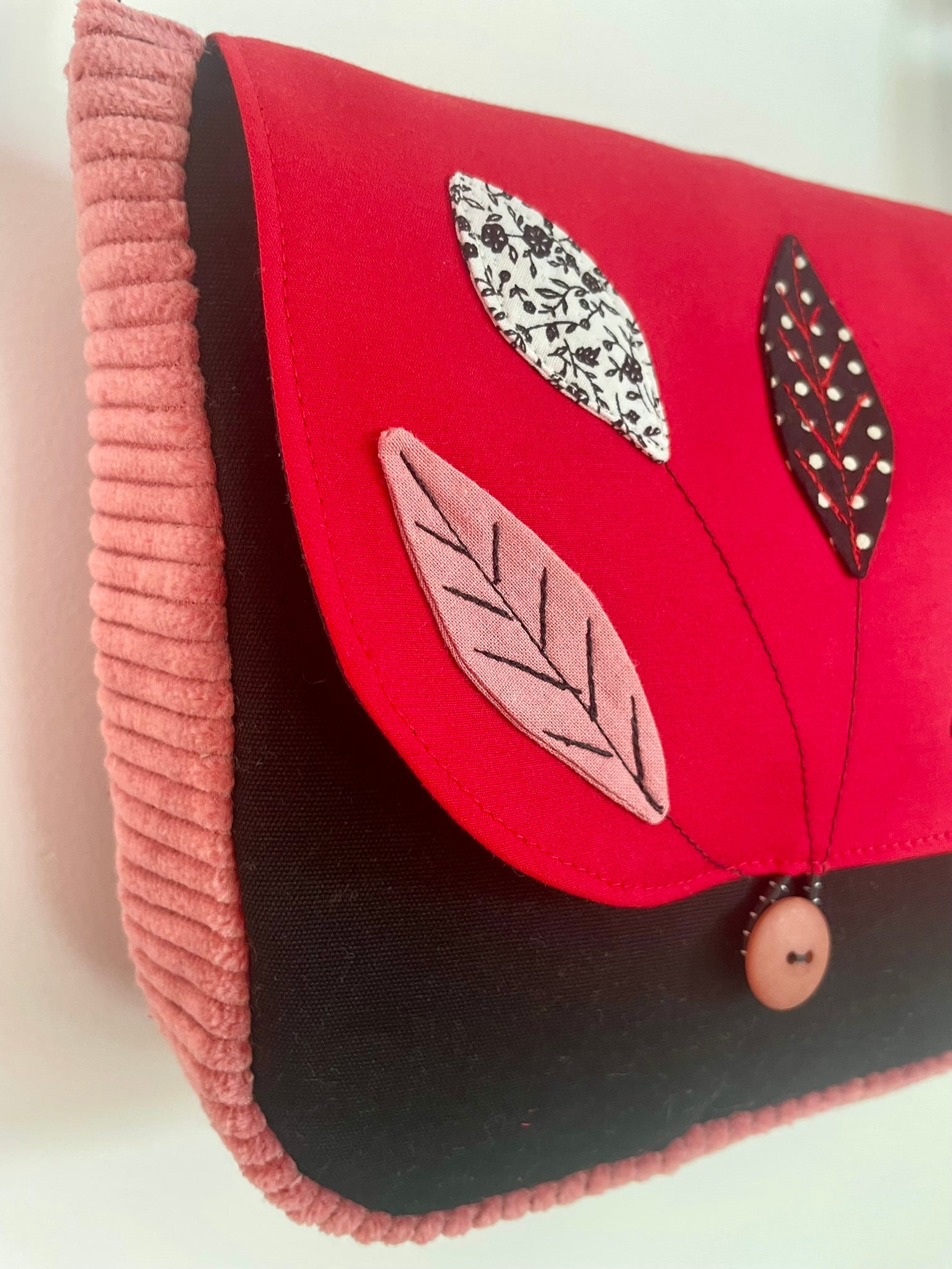 Sac en coton et velours côtelé noir, rouge et rose à feuillages