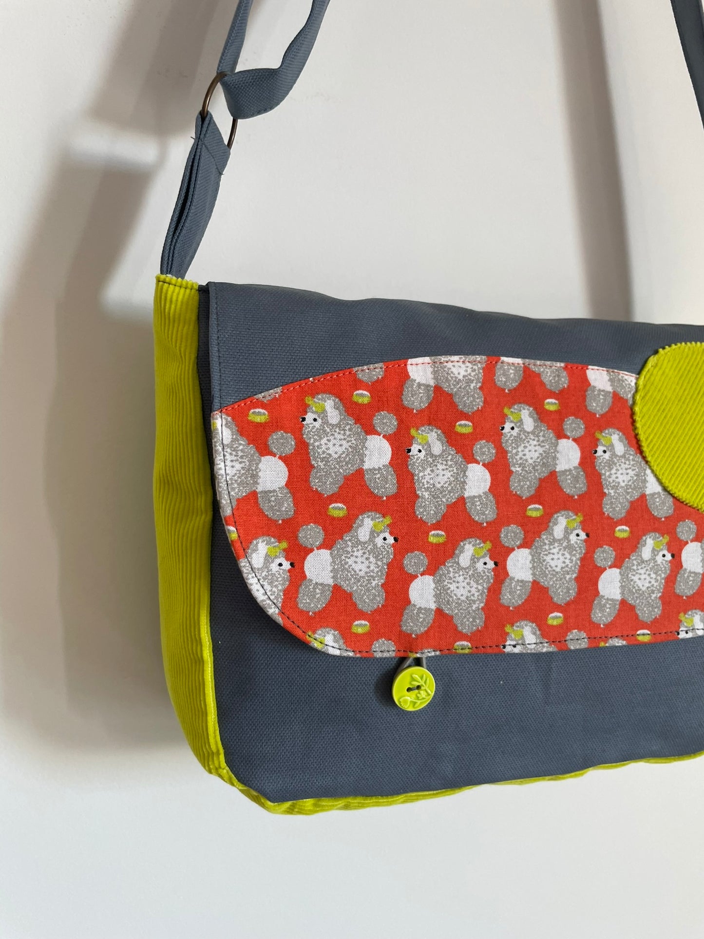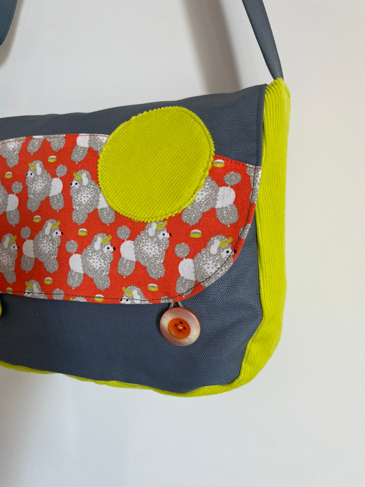 Très pop ! Sac en coton enduit (imperméable) et velours côtelé à porter à l'épaule ou en bandoulière gris et vert anis. Rabat fantaisie avec appliqués et surtout des caniches sur fond orange.