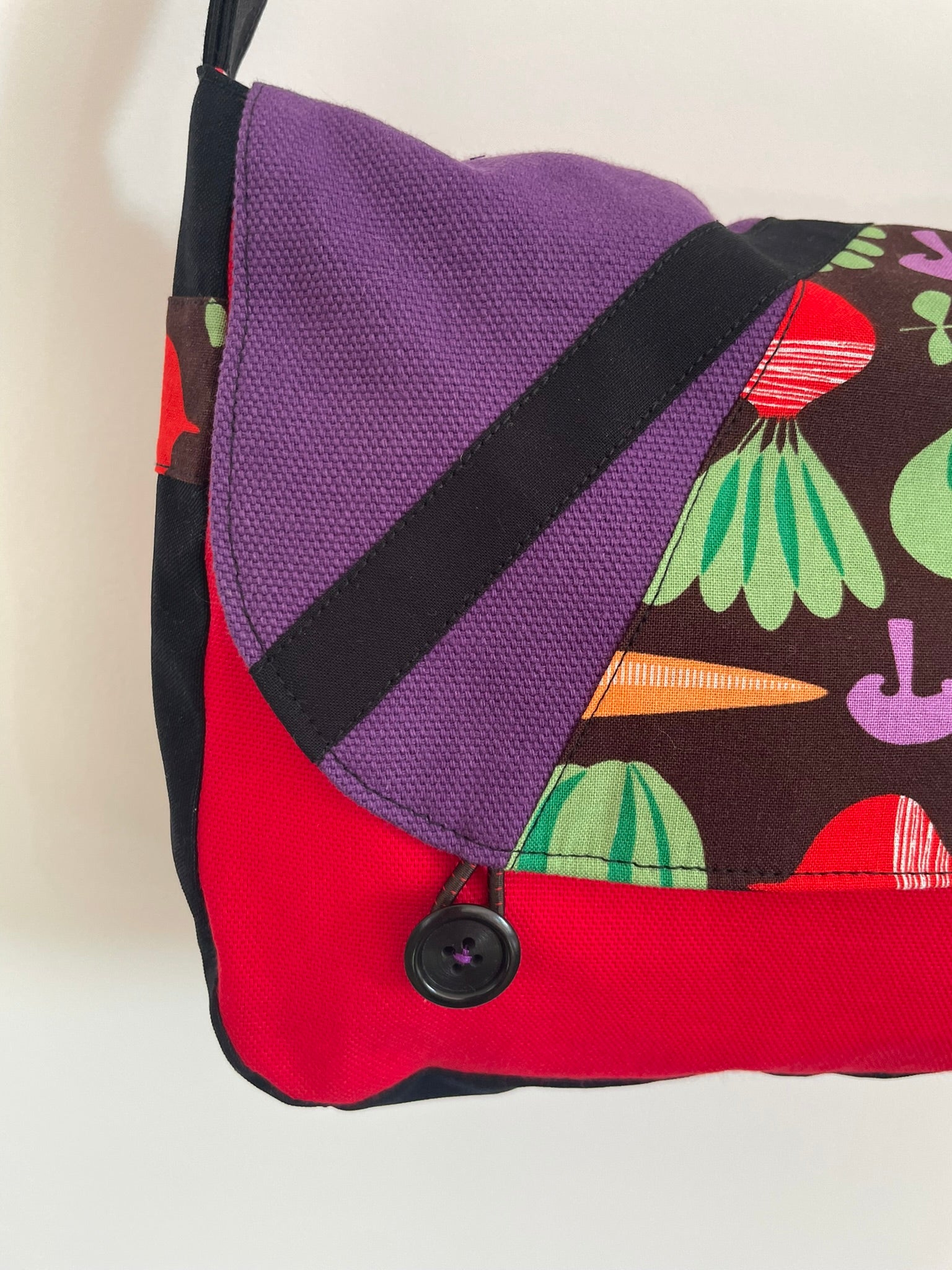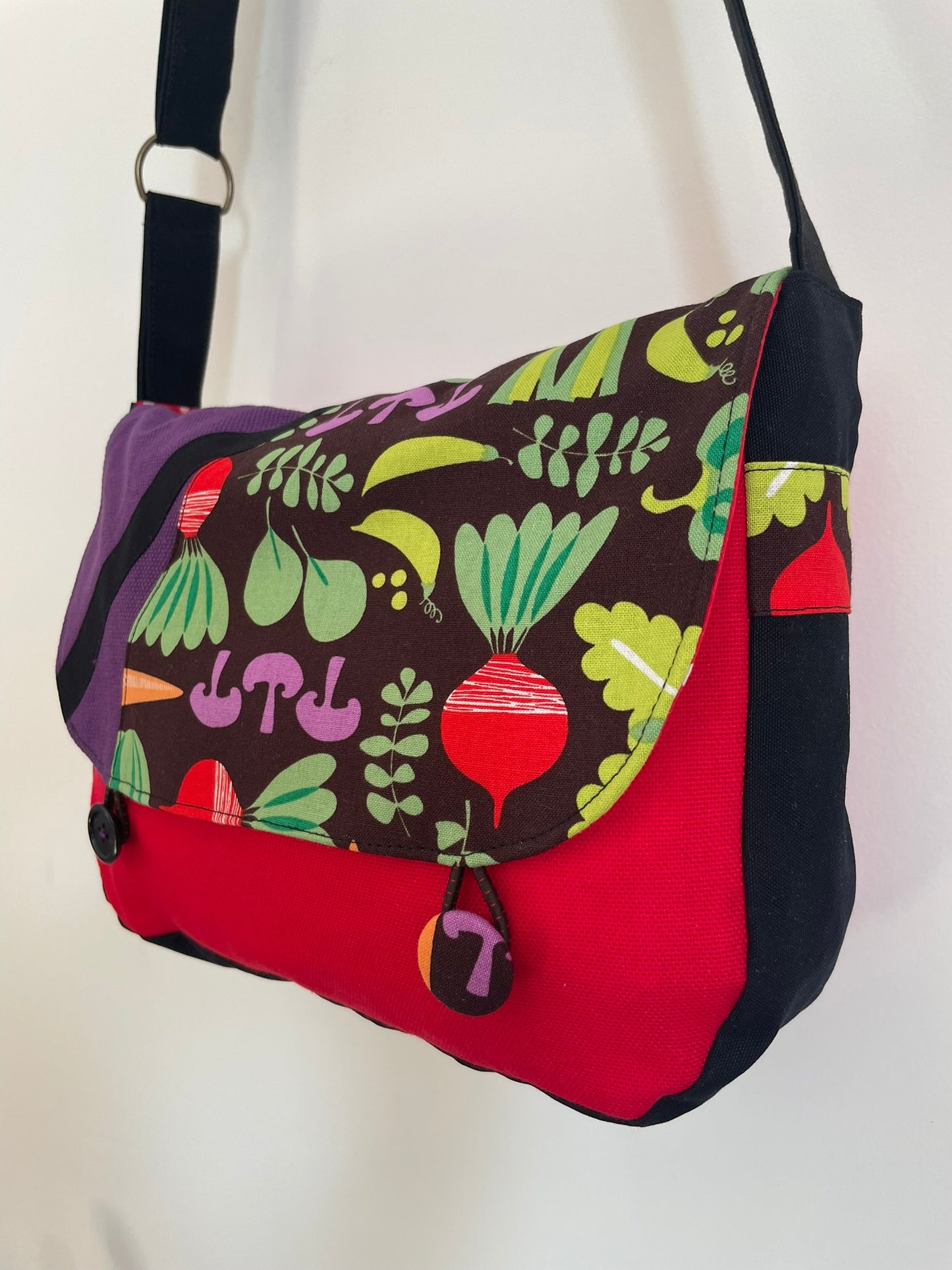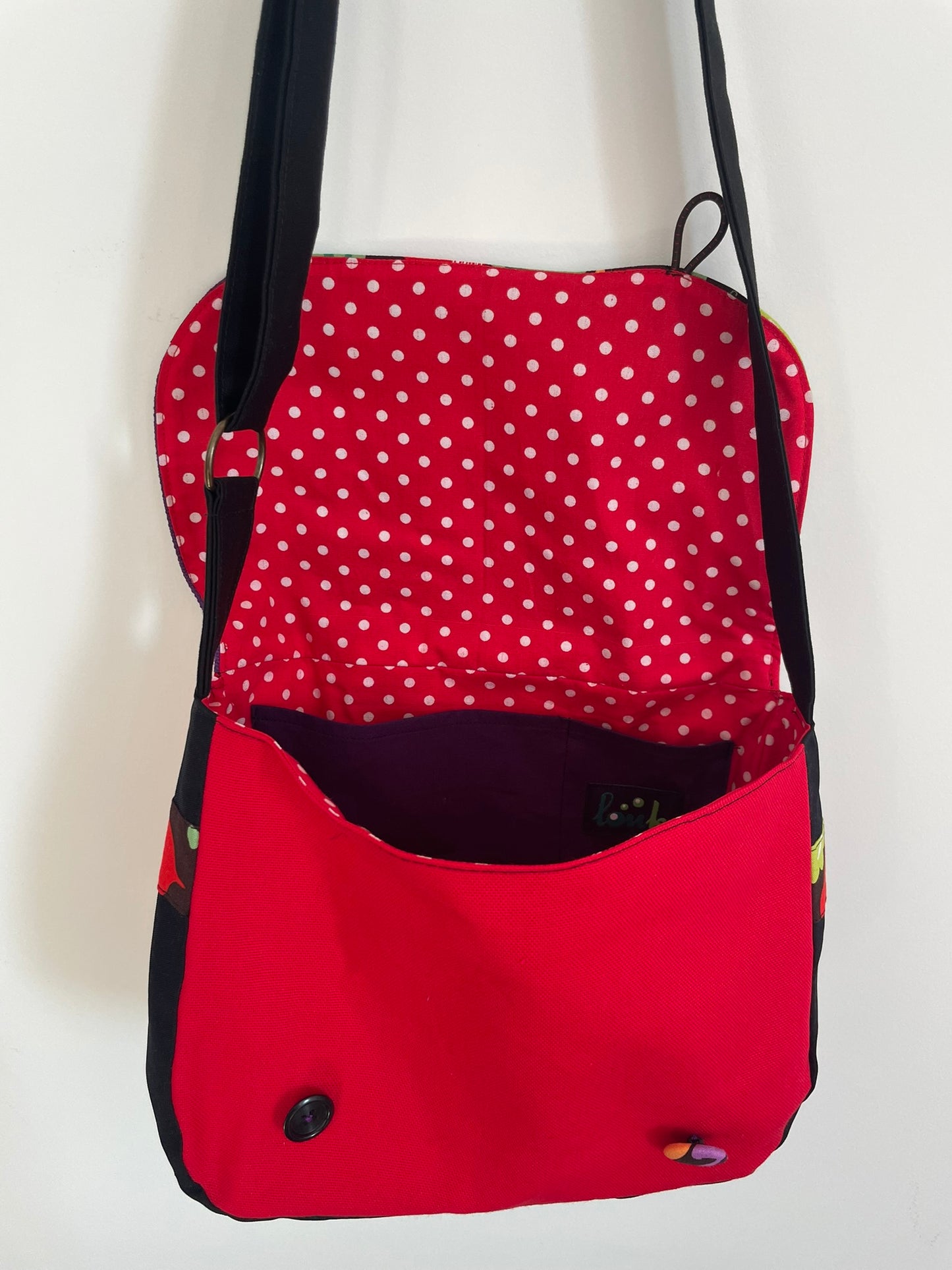 Un petit tour au marché ? Sac en gabardine de coton (coton épais) à porter à l'épaule ou en bandoulière noir et rouge. Rabat fantaisie avec appliqué à motifs légumes (même hors saison!).