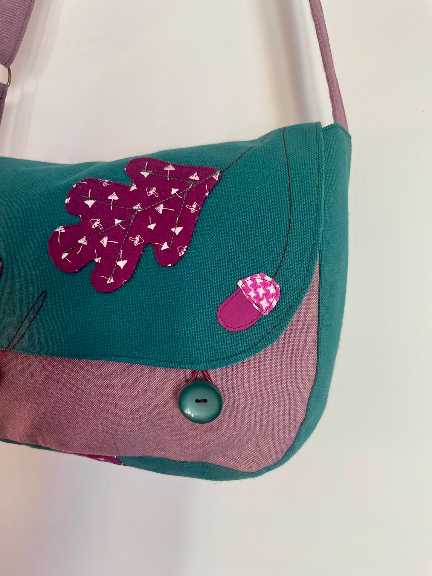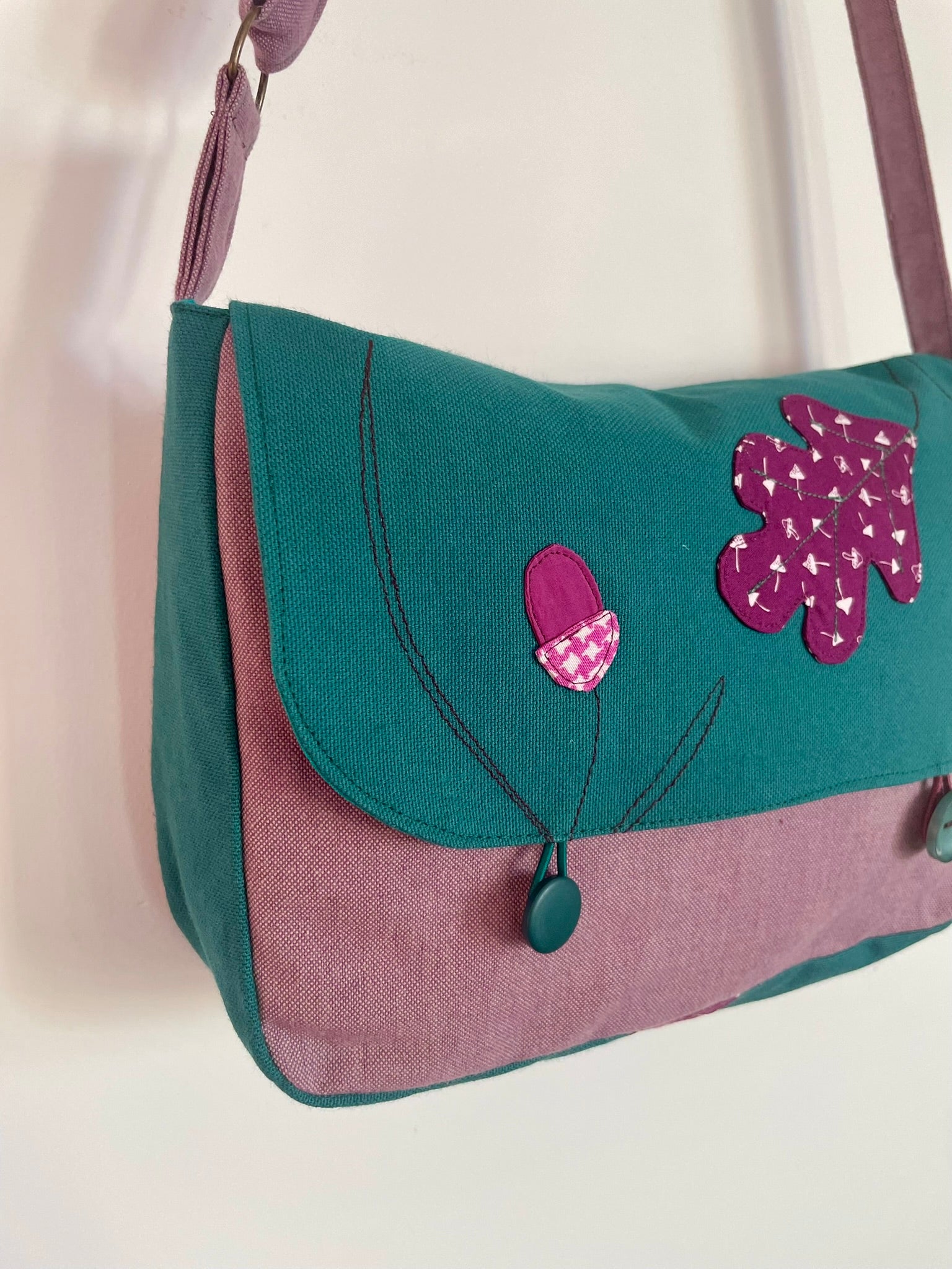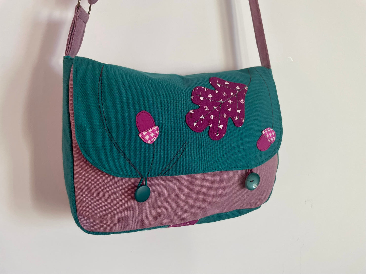 Sac en gabardine de coton (coton épais) à porter à l'épaule ou en bandoulière violet et vert émeraude. Rabat fantaisie avec appliqués feuille de chêne et glands.