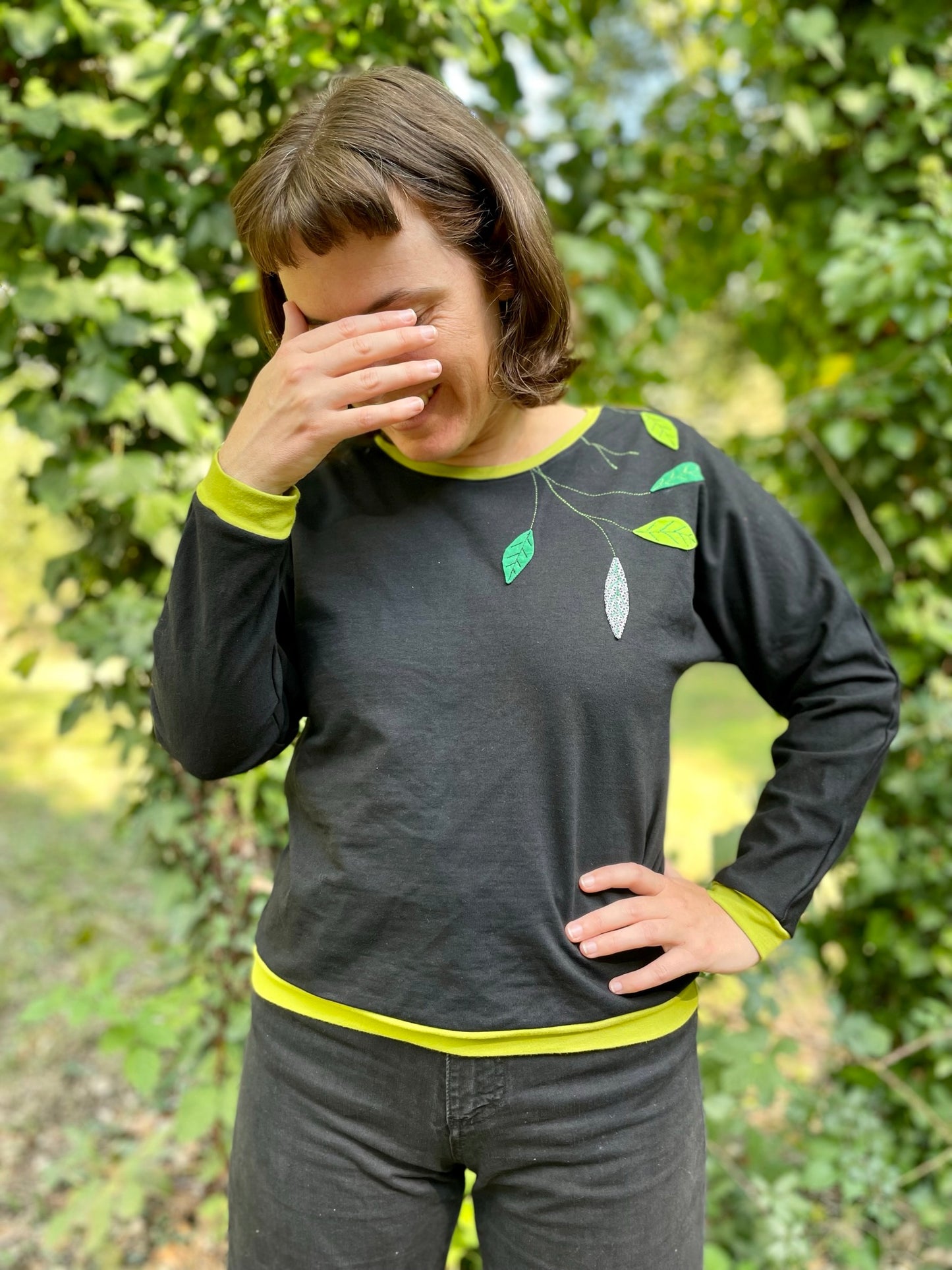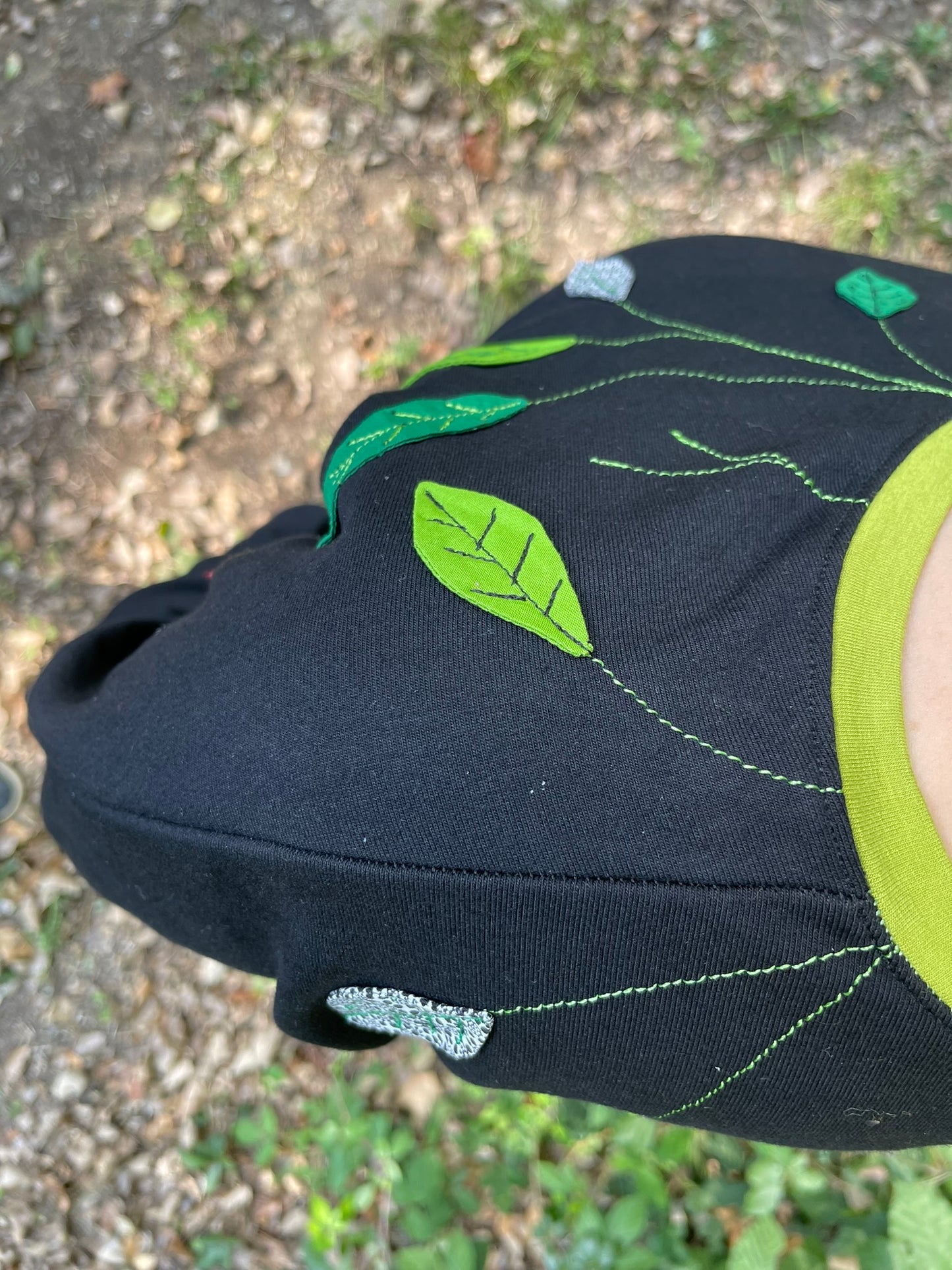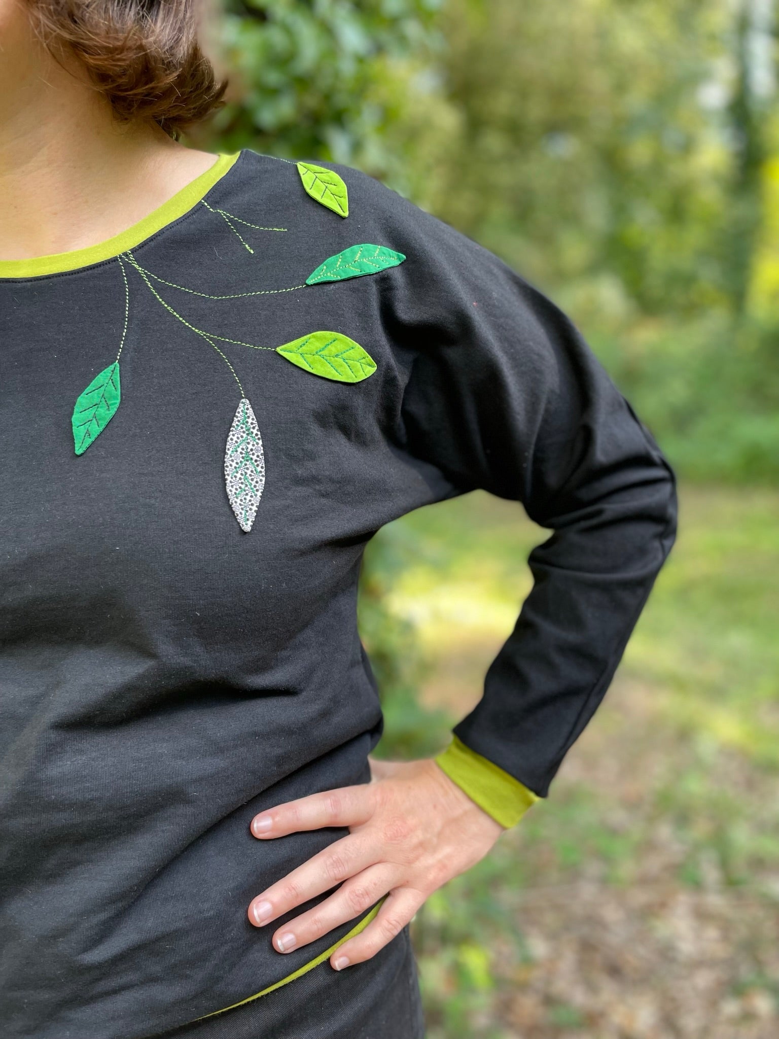 Liserés vert anis à l'encolure, aux manches et en bas du sweat. Appliqués feuillages dans les tons verts sur le côté du devant et sur l'épaule.