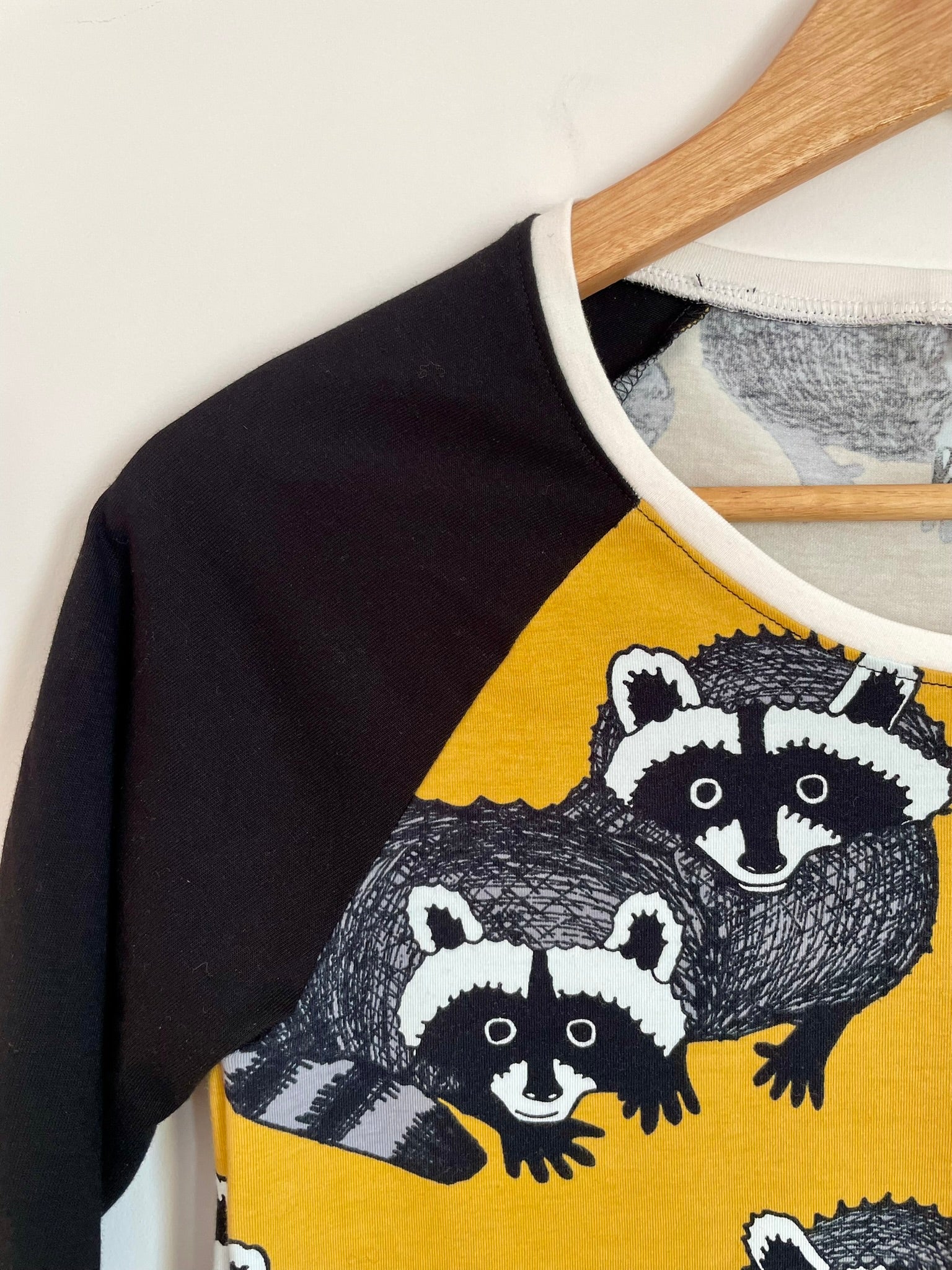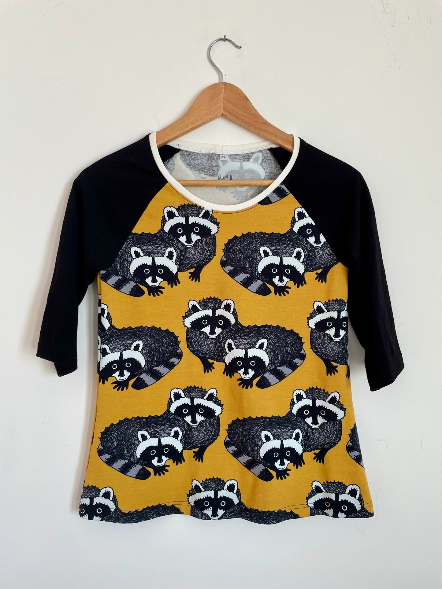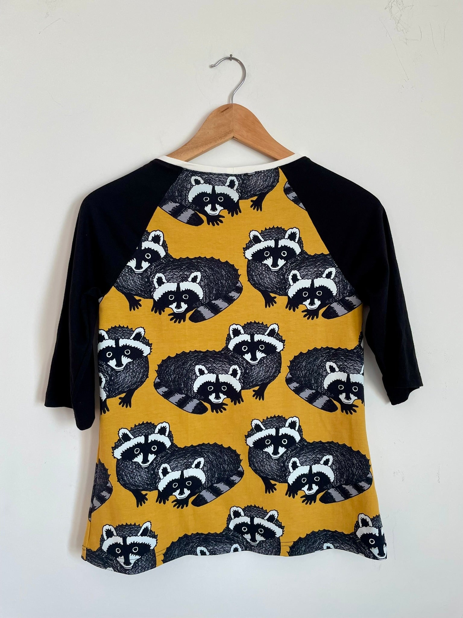T. shirt femme en jersey de coton jaune à motifs ratons laveurs, manches raglan 3/4 réalisées dans un autre tissu, ici un jersey de coton noir.