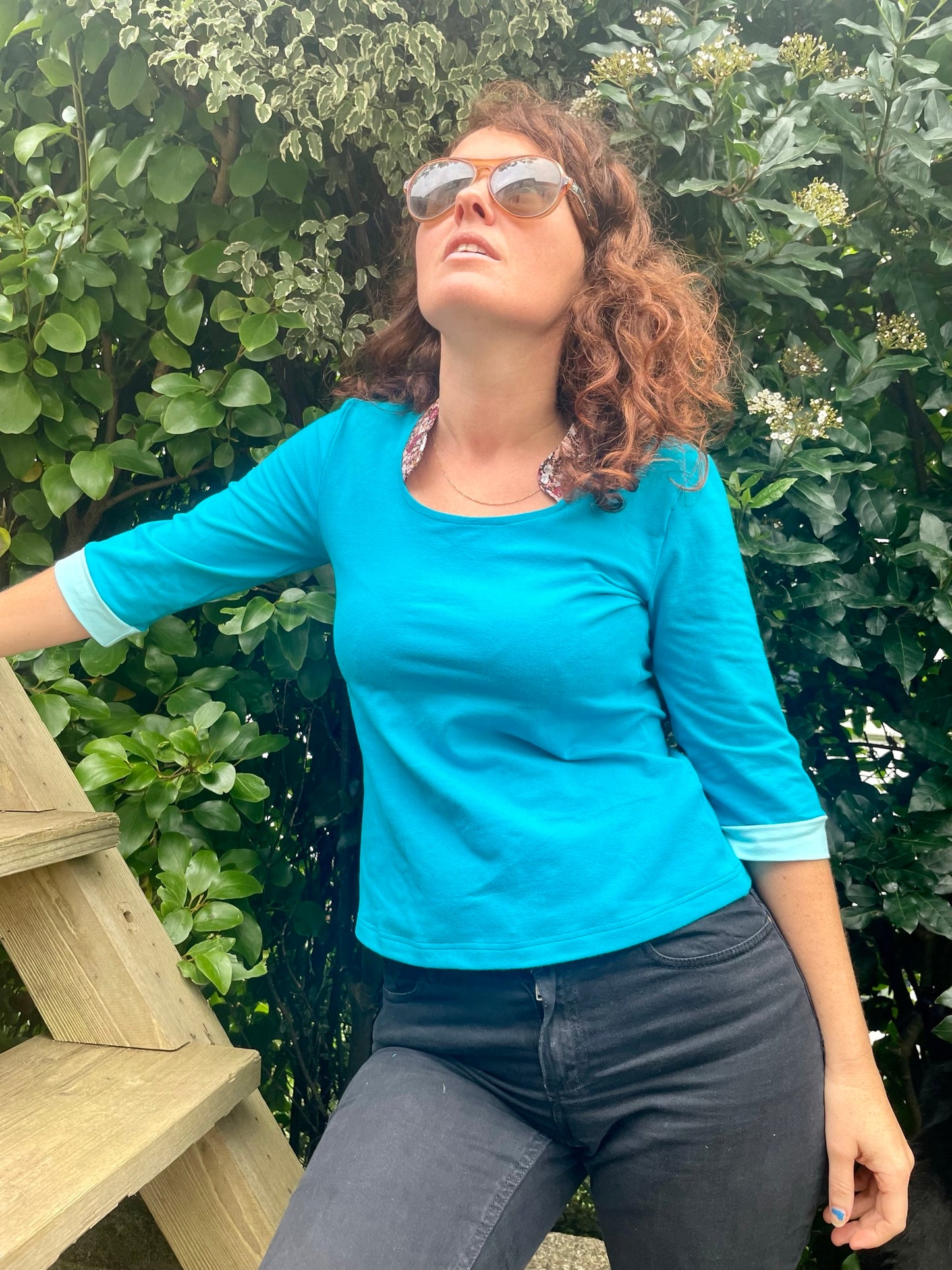 T. shirt femme en coton et élasthanne turquoise, manches 3/4. Petit col en coton marron foncé à fleurs rose et brun, bande contrastante bleu clair en bas des manches.